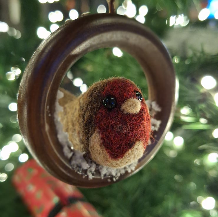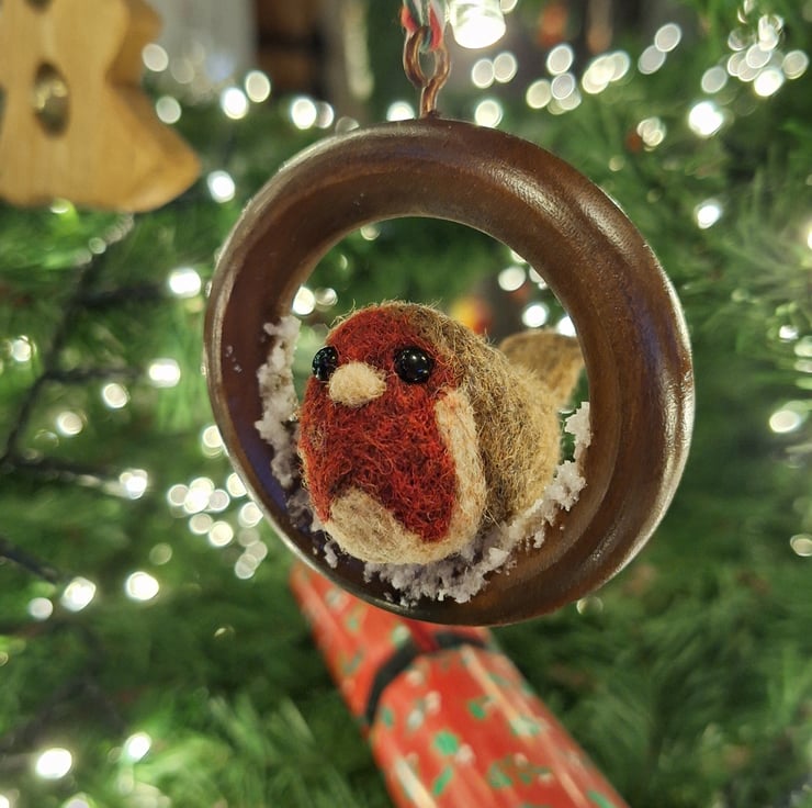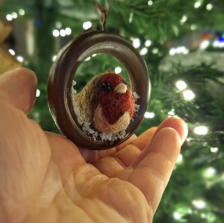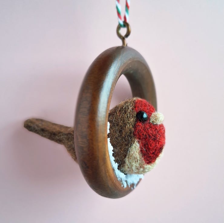 Each Robin is handmade from carded wool, with tiny glass eyes, and each ring has a wee dusting of fake snow!