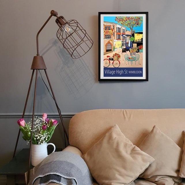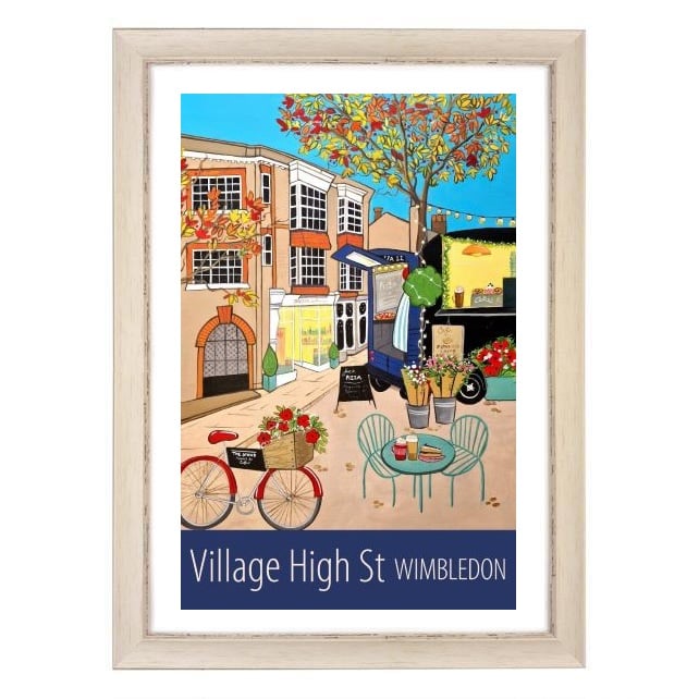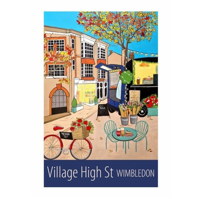 A travel poster print of the High Street in Wimbledon Village, with it's lovely shops and cafes, from my own original acrylic painting.