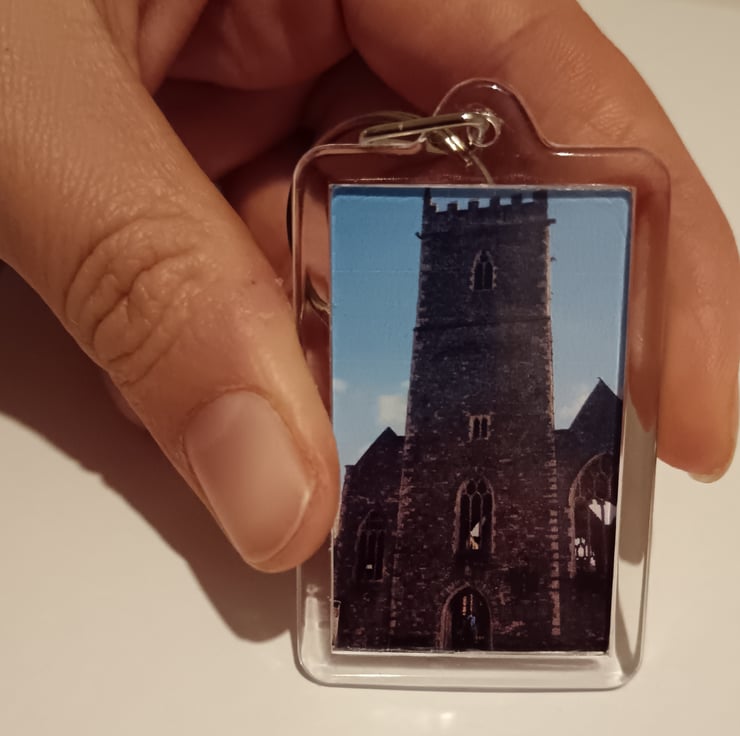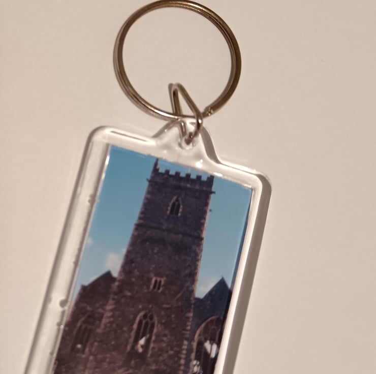 This keyring features St Peter's Church which is based in Castle Park, Bristol, England, UK. It is a ruined medieval church which now left as a memorial as it was bombed in WWII.