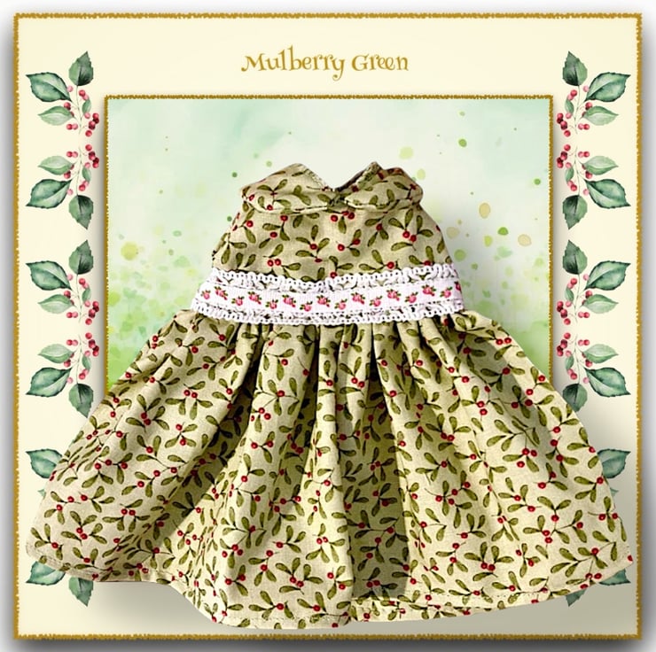 A lovely little green dress in a red berry mistletoe print, to fit the Mulberry Green characters. The dress is made from best quality cotton and has a lined bodice and Peter Pan collar.