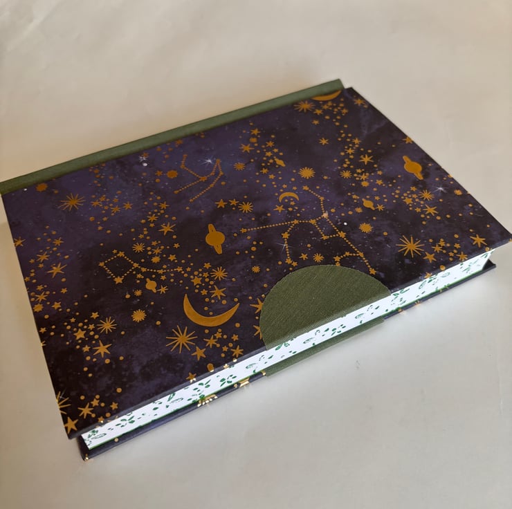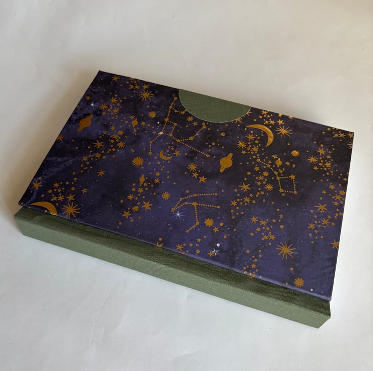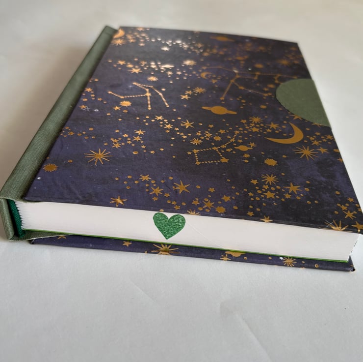 A striking book bound in the style known as 'Bradel', this beautiful book is covered in lovely paper depicting the night sky with a soft dark green binding and has decorated page edges. It is A5 size and filled with many pages of good quality white paper. It would make a very lovely gift
