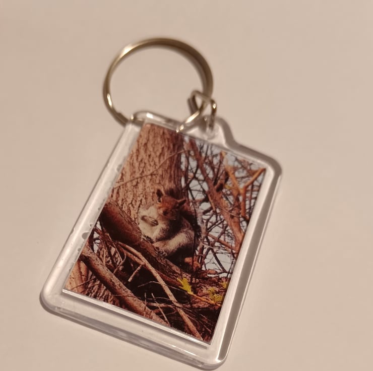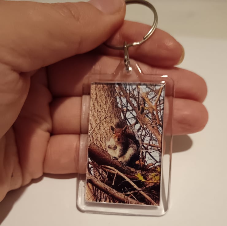 Adorable keyring featuring a cute grey squirrel. Photography made by myself. Opposite side is blank. Great gift for an animal lover!