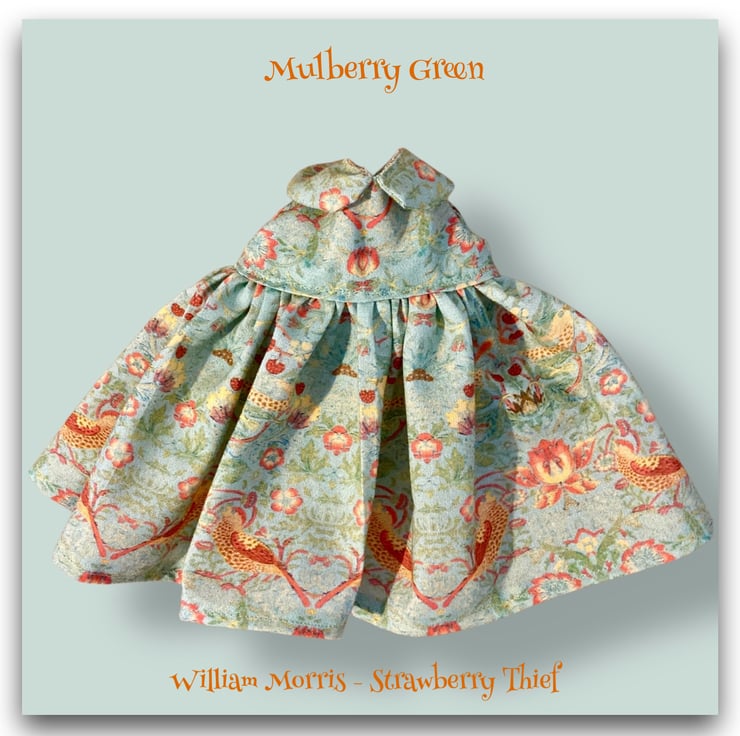 A beautiful turquoise dress in a William Morris Strawberry Thief print, to fit the Mulberry Green characters. The dress is made from best quality cotton and has a lined bodice and Peter Pan collar.