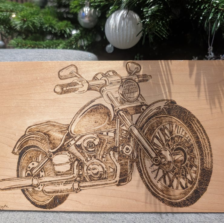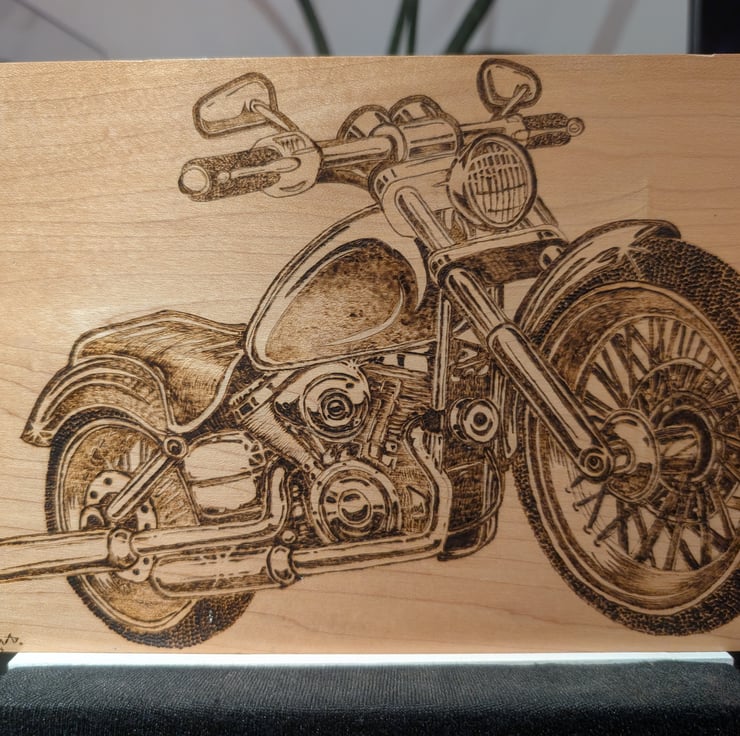 Beautiful motorcycle pyrography art. Great gift for motorcycle enthusiast, addition to a man cave or an art piece on the shelf or an office.
