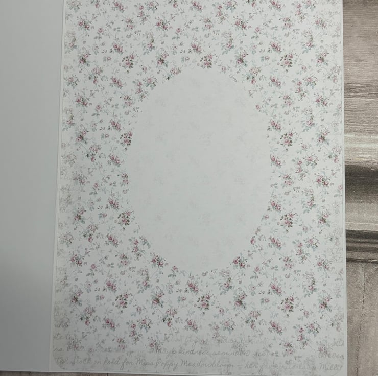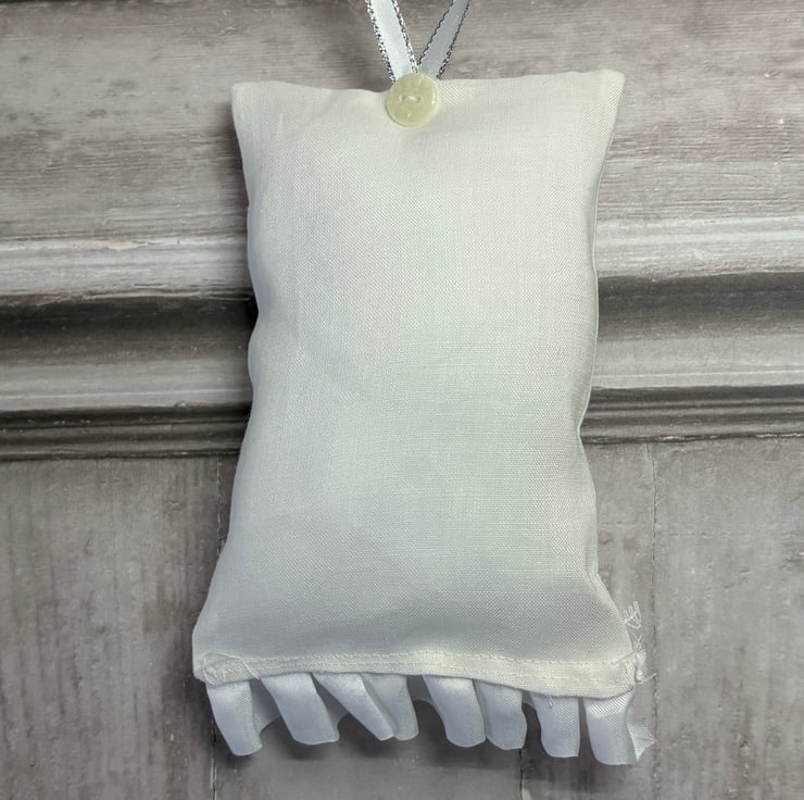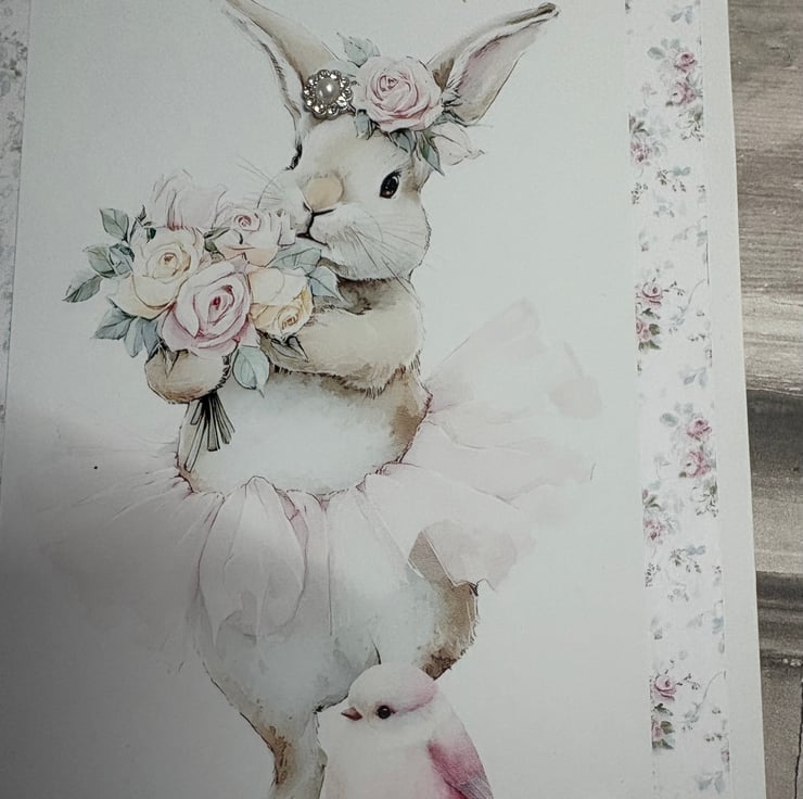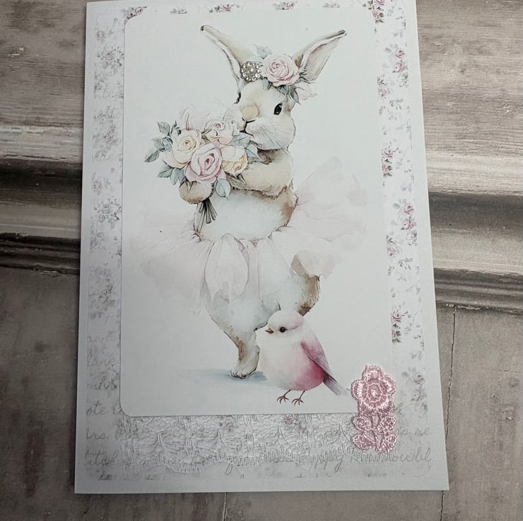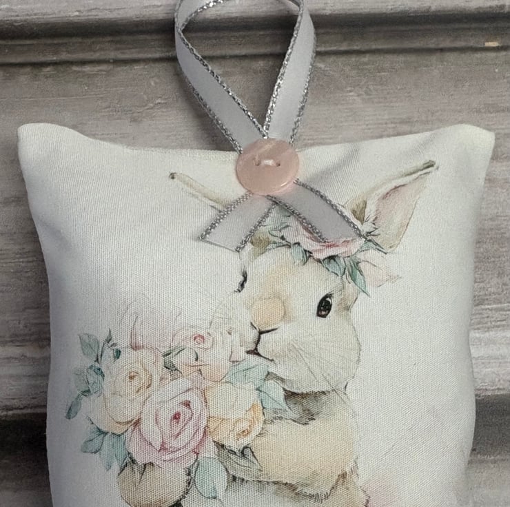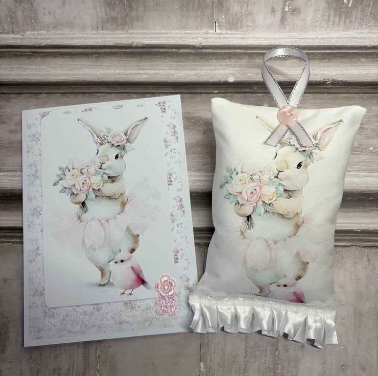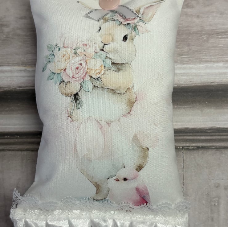 A delicate door hanger with matching 7" x 5" (12.8cms x 17.8cms) card, printed onto cotton, backed with linen and edged with ruffled ribbon lace trim, white ribbon with silver lurex edging and a pearl pink button for hanging on a dressing table or bed post. . Door hanger Measuring 6.5 x 4" (16.5cms x 10cms). The print is a designers print with cute bunny and small bird. Filled with Polyester Fibrefill.