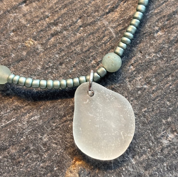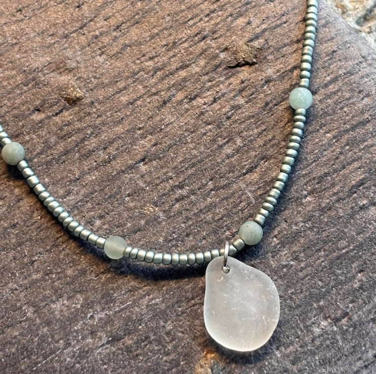 Small and delicate necklace with hand drilled Sea Glass, small Amazonite beads and metallic seed beads on thread. Silver coloured lobster clasp and extender chain. Ay shortest 39cm, with extender chain at longest 44cm. Sea glass is cloudy white and piece is approx 2cm length.Each of my items are unique one off designs made in the moment using what speaks to me on the particular day.