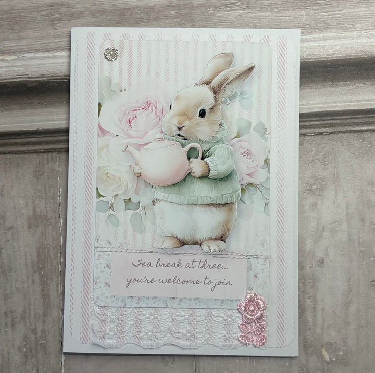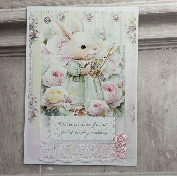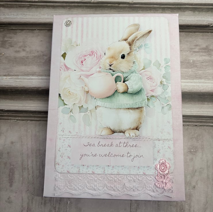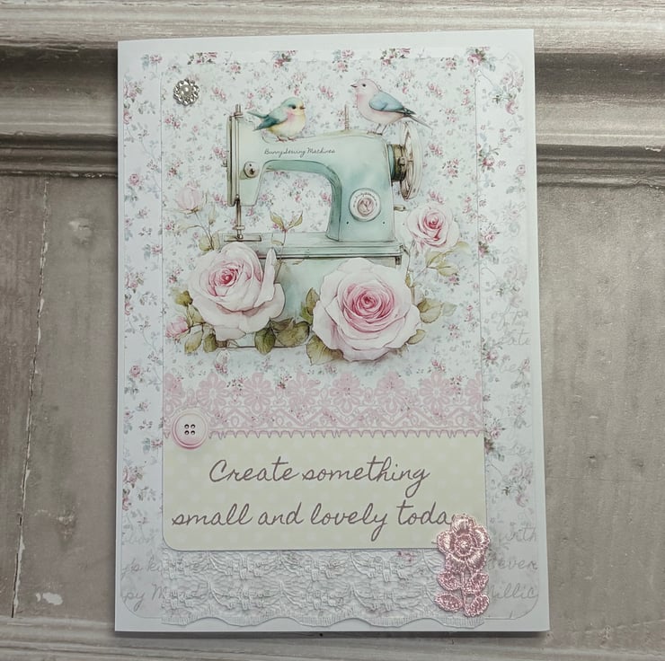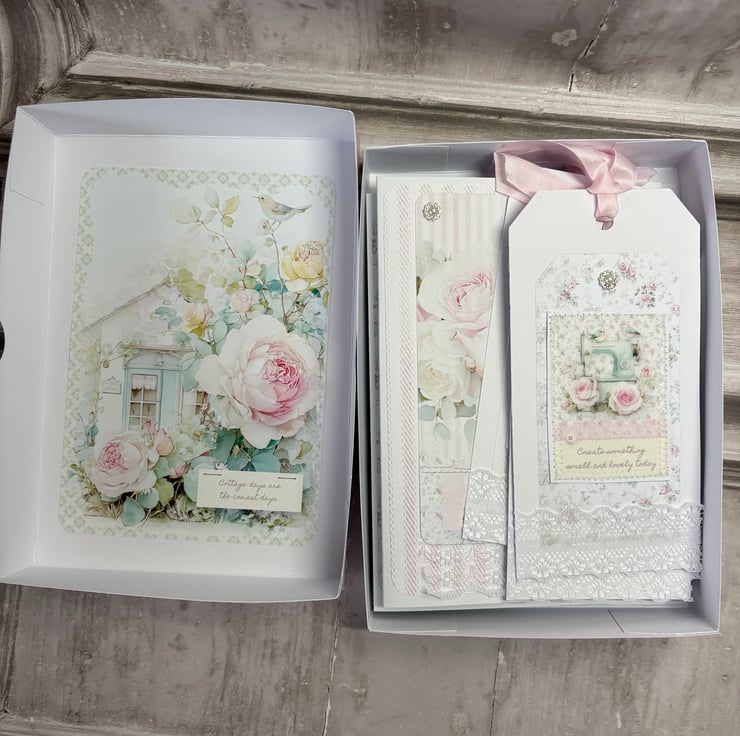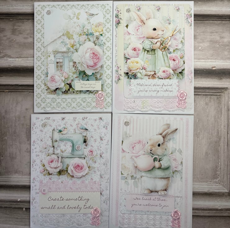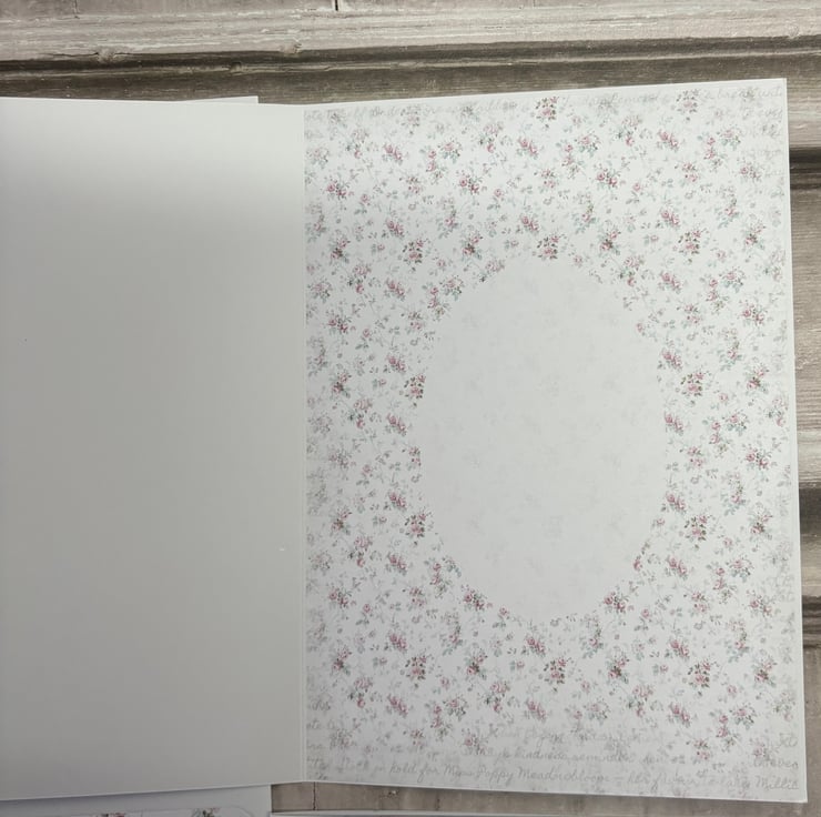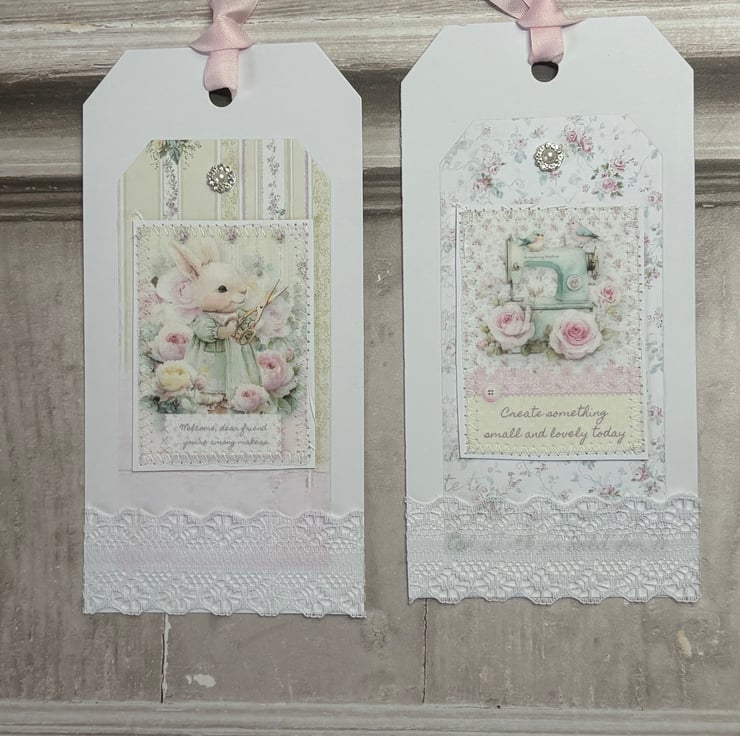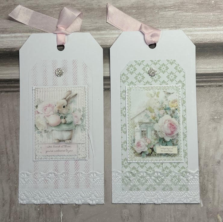 Set of 4 5" x 7" (12.8cms x 17.8cms) delicate designer print cards with matching tags 6.25" x 3" ( 16cms x 8cms). The cards have a complimentary backing paper with lace trimmed a diamanté detail. Tags are plain white card with complimentary backing paper and the image is printed onto fabric, stitched onto card. Diamante detail and faux silk pink ribbon for hanging.