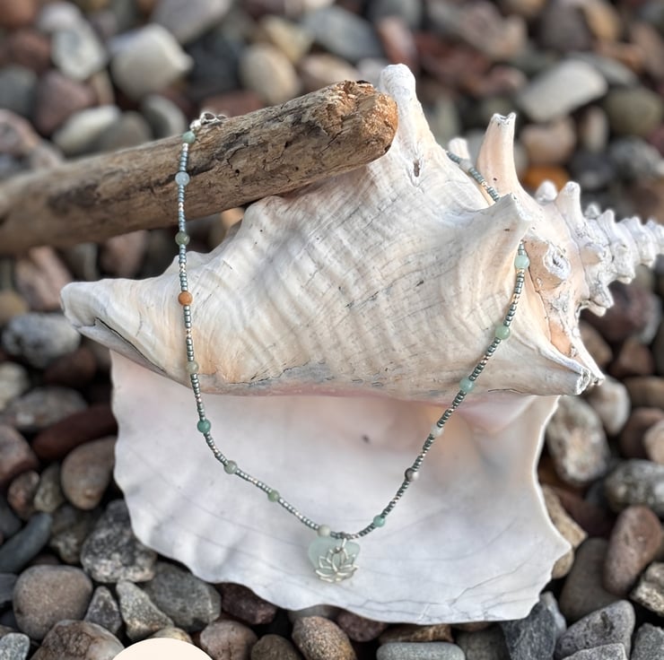 Pale green seaglass on waxed thread with blue/green metallic and silver seed beads and tiny Amazonite beads. Sterling Silver Lotus Charm. Silver coloured lobster clasp and extender chain. At shortest length is approx 39cm, using extender chain at longest approx 44cm. Seaglass and charm are approx 1.5cm height and just under 2cms width across.Seaglass is original as found, not tumbled or shaped and hand drilled.Each of my items are unique one off designs made in the moment using what speaks to me on the particular day.