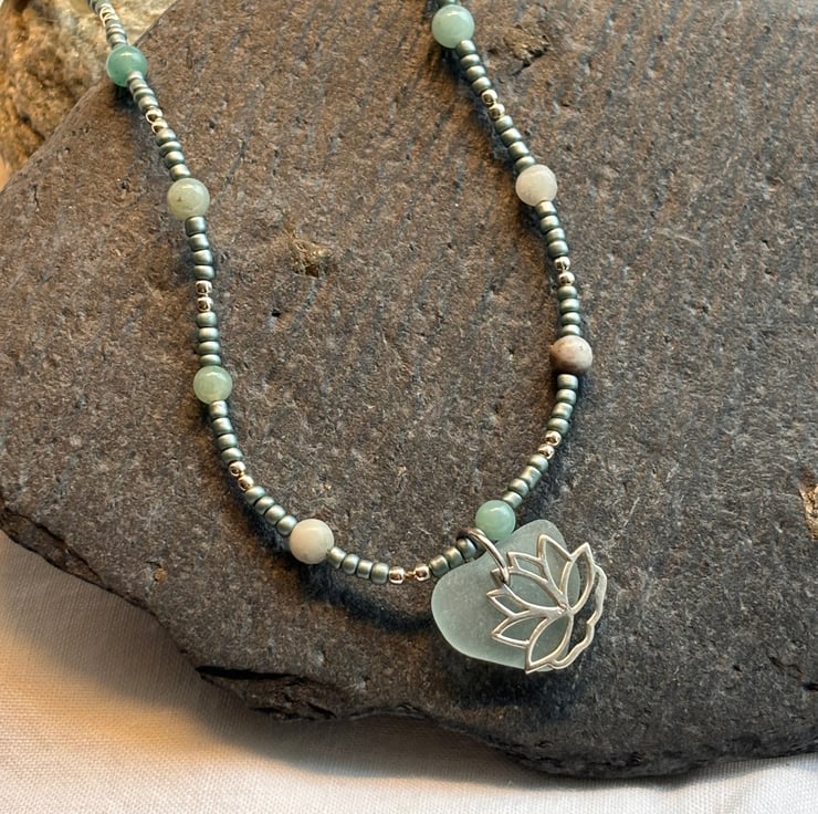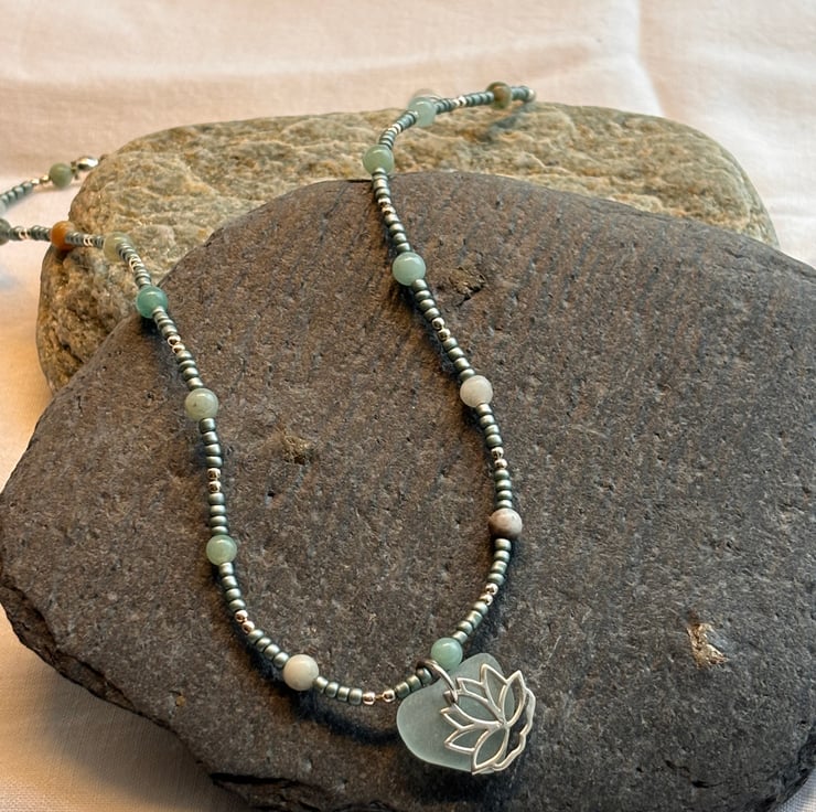 Necklace - Seaglass and sterling silver lotus charm, amazonite and seed beads