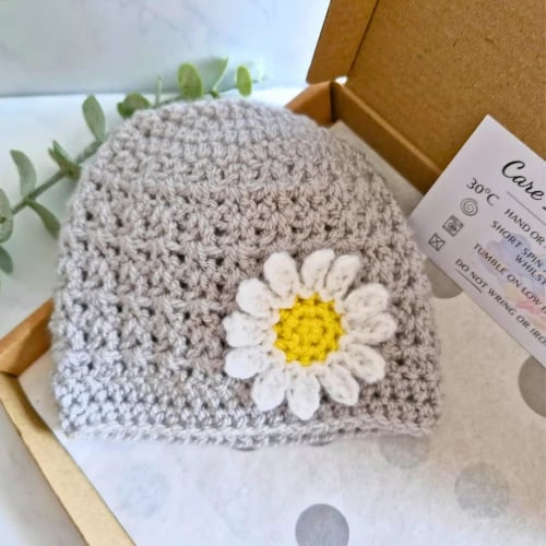 A soft, cosy crochet beanie featuring a white daisy with a bright yellow centre. Handmade with care using Stylecraft Special DK, this lightweight hat adds a lovely touch to any little one’s outfit and is gentle on sensitive skin.
