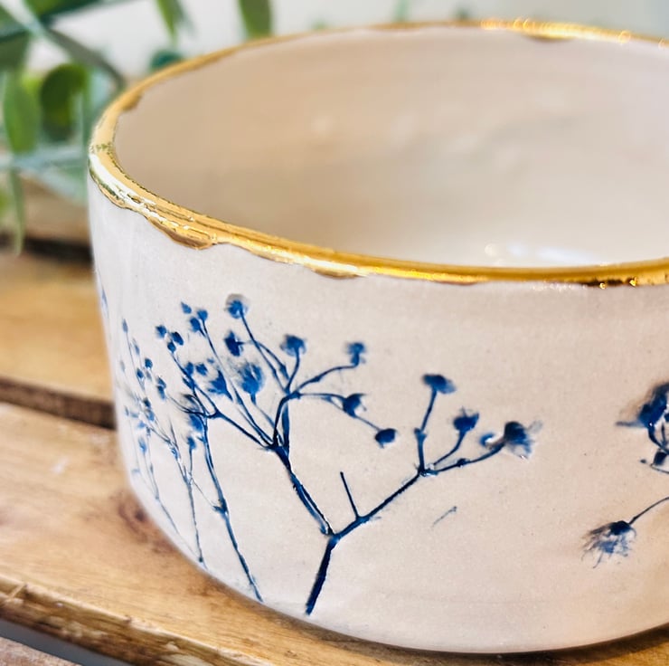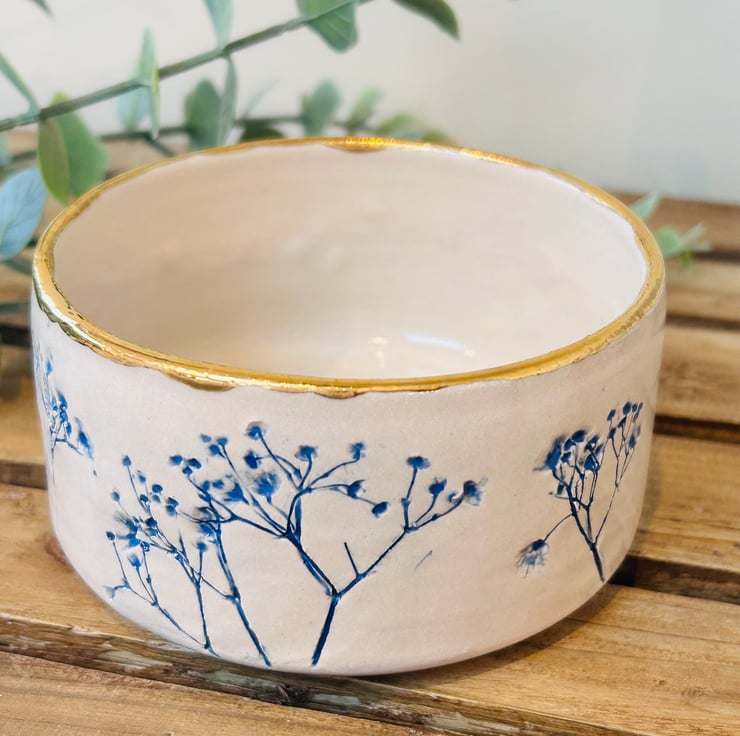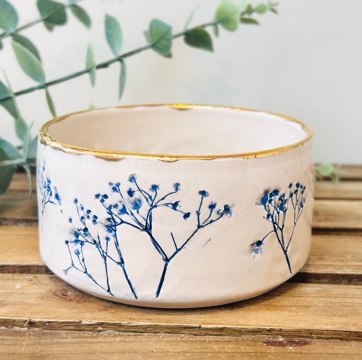 This particular bowl is 10.5cm wide by 6cm tall and pressed with gypsophelia
