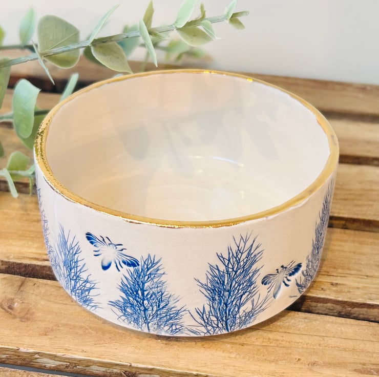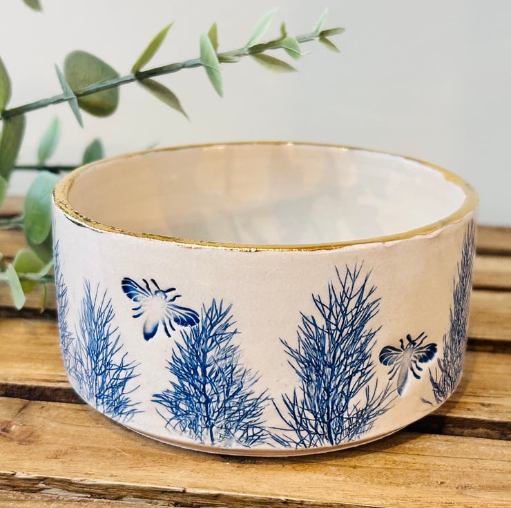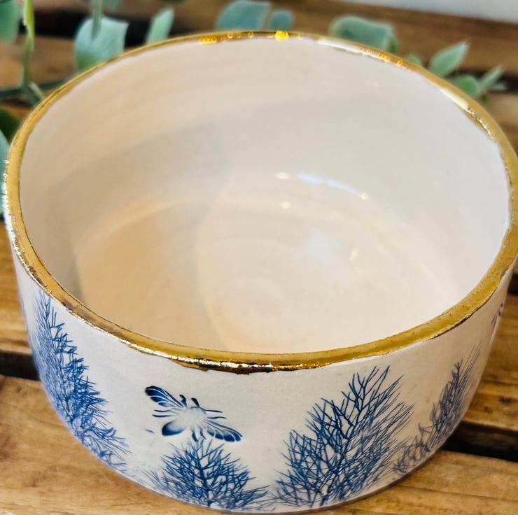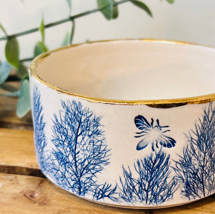 This particular bowl is 11cm wide by 6cm and tall and pressed with fennel from my garden. This bowl had the addition of some bees stamped on.
