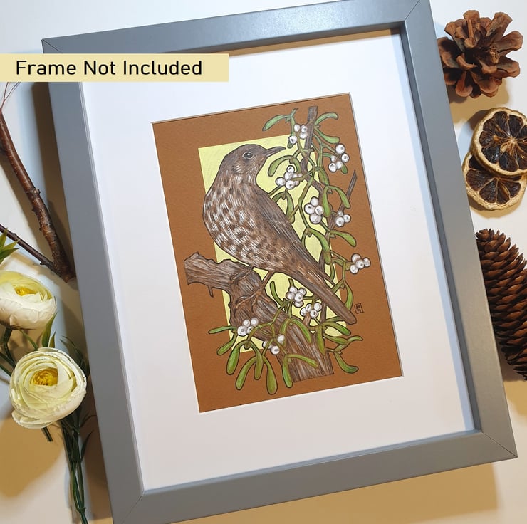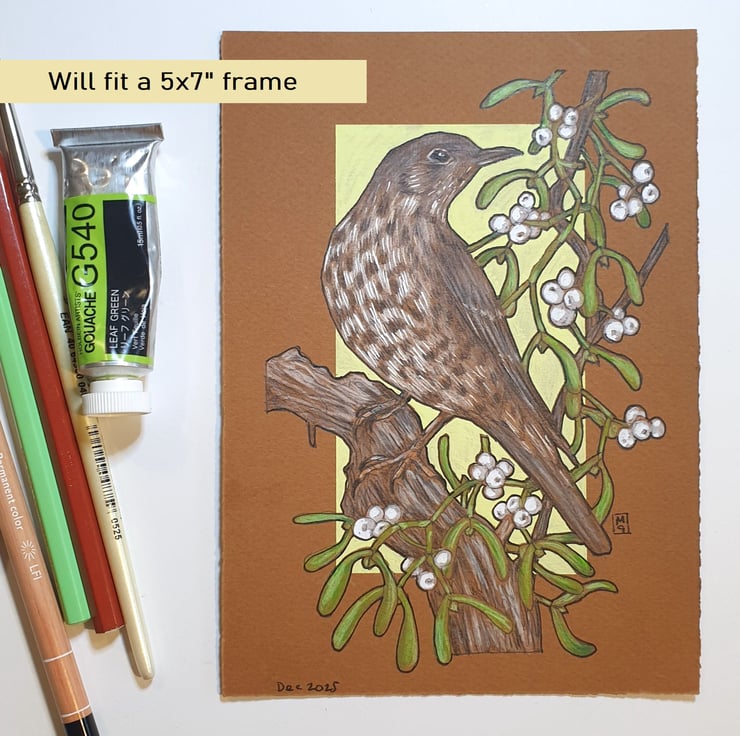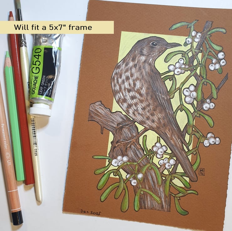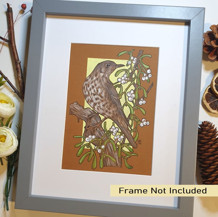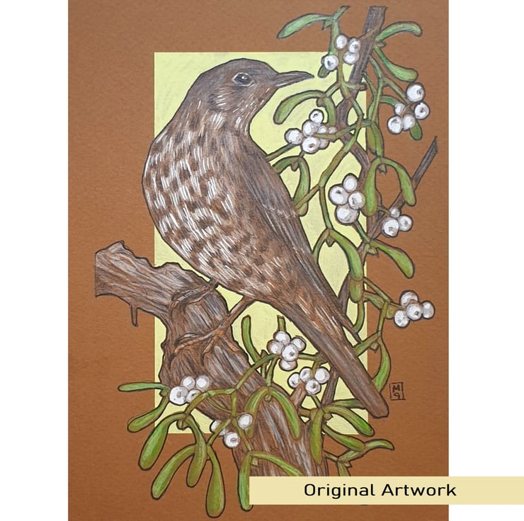 A Mistle Thrush with Mistletoe original drawing, small artwork, bird wall art