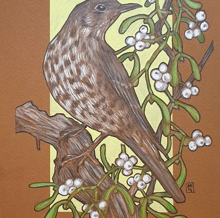 A small drawing of a mistle thrush bird sitting on a branch laden with mistletoe with white berries. The bird is brown with a pale breast with dark spots. The drawing is on brown paper with a light green background.