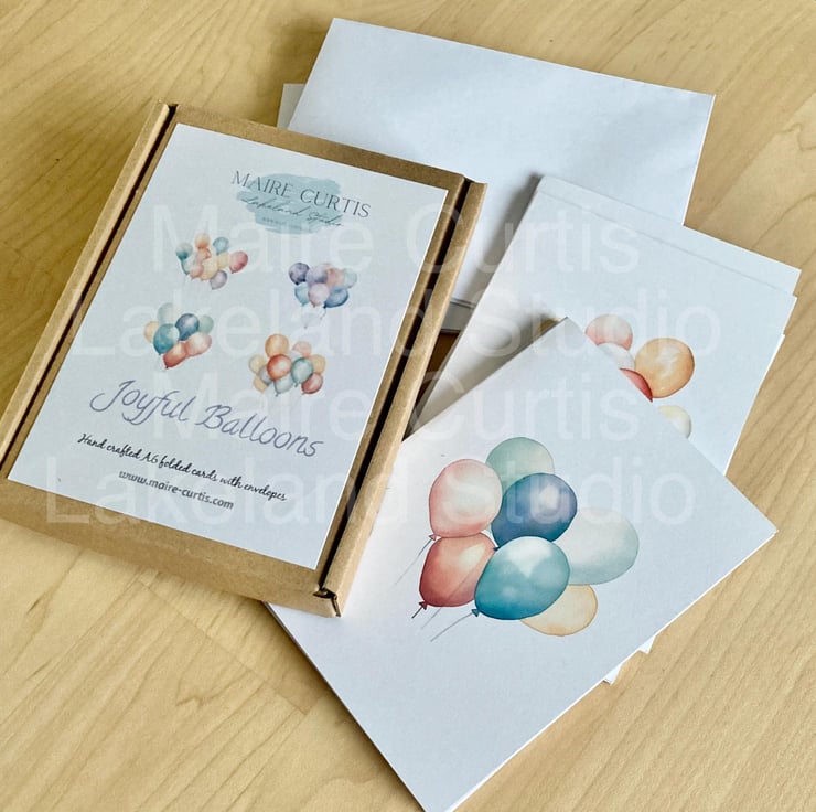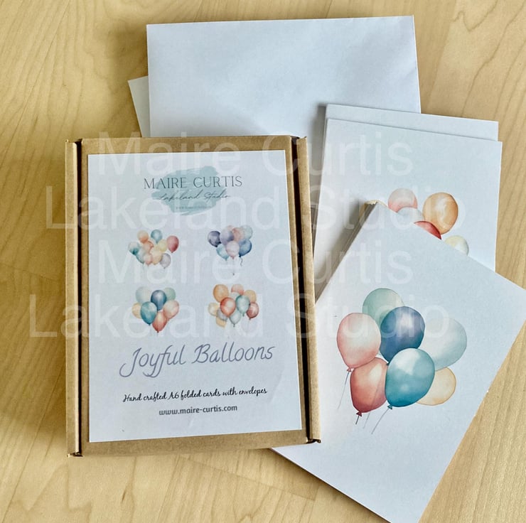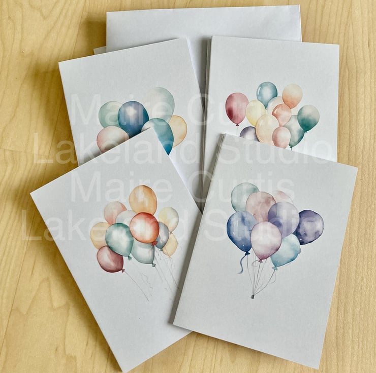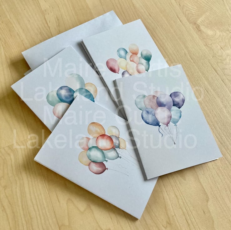 Printed on FSC certified, high quality white satin cardstock, the images feature: Four different balloon designs which blank inside and without sentiments to allow your own creativity. They are perfect as note cards, birthday cards or thank you cards.