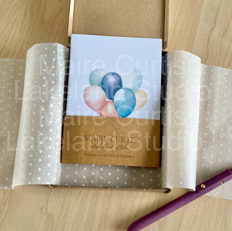 Watercolour pastel balloons feature in our A6 pack of twelve folded 10.5 x 14.8 cm (approx) note cards. Open out to A5.