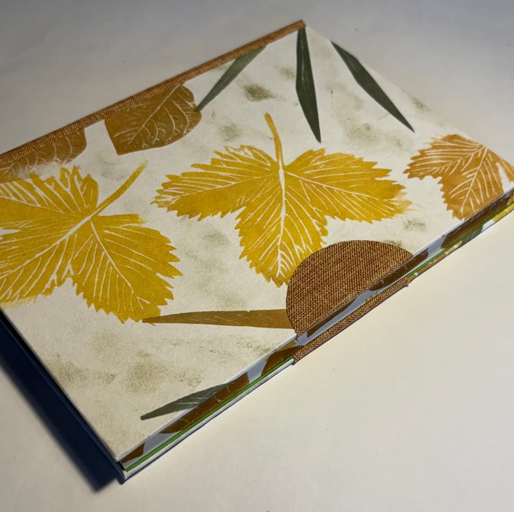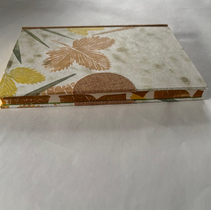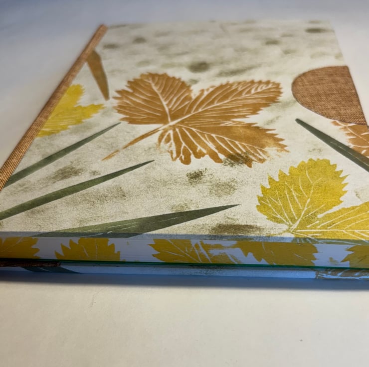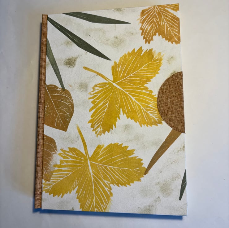 This book is covered in hand-printed paper of leaves from my garden. It has a rust-coloured book cloth spine and semi-circle fingermark protector. It also has decorations on the edges of the pages. It is roughly A5 size so it is a book to be kept on the desk for writing or sketching. Attractive and unique.