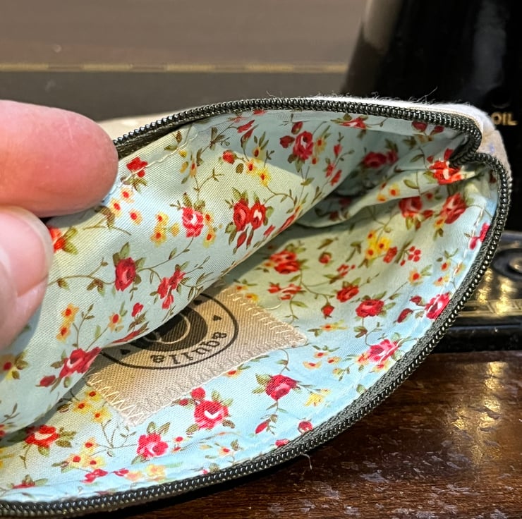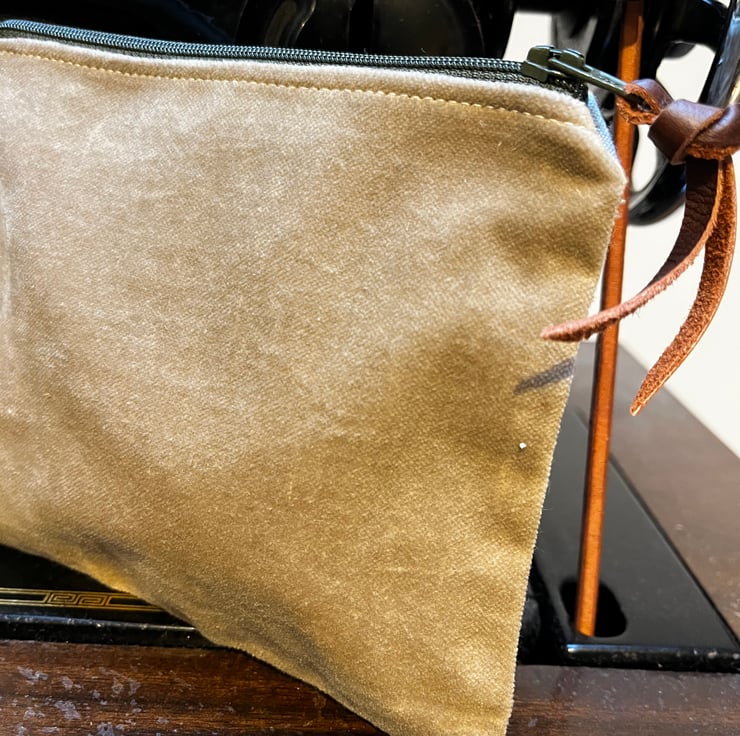 A strip of leather is tied to the zip pull. The leather was waste from an local upholsterer. This can be swapped for ribbon if preferred, just add a note at checkout.
