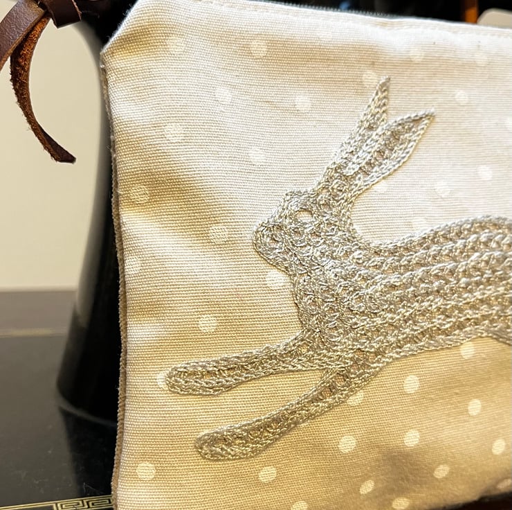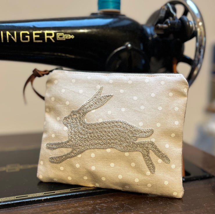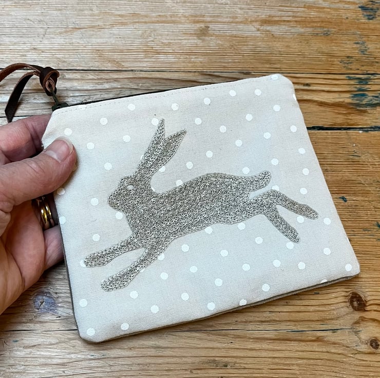 One of a kind small pouch with an embroidered hare on the front. The back is a velvety beige moleskin fabric. The pouch is lined with pretty floral cotton. The outer fabrics came from sample swatches.