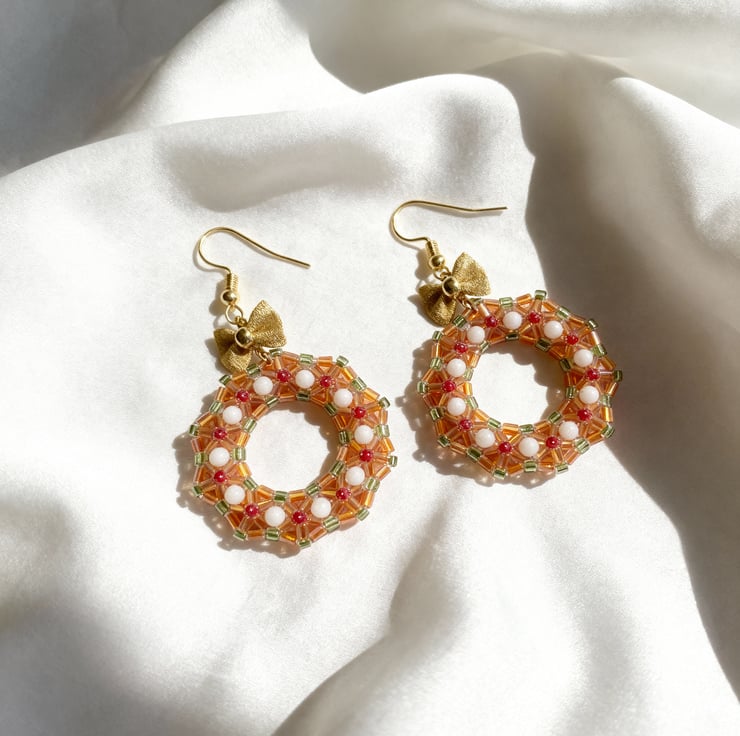 These earrings were inspired by the warmth and joy of Christmas decorations—especially the classic wreath hung proudly on front doors. I wanted to capture that cosy, festive feeling in a wearable form, using bright beads to mimic holly berries and a golden bow to echo the magic of the season. Each pair is designed to bring a little Christmas cheer wherever you go.