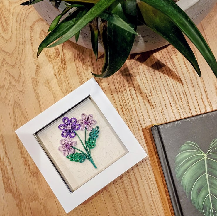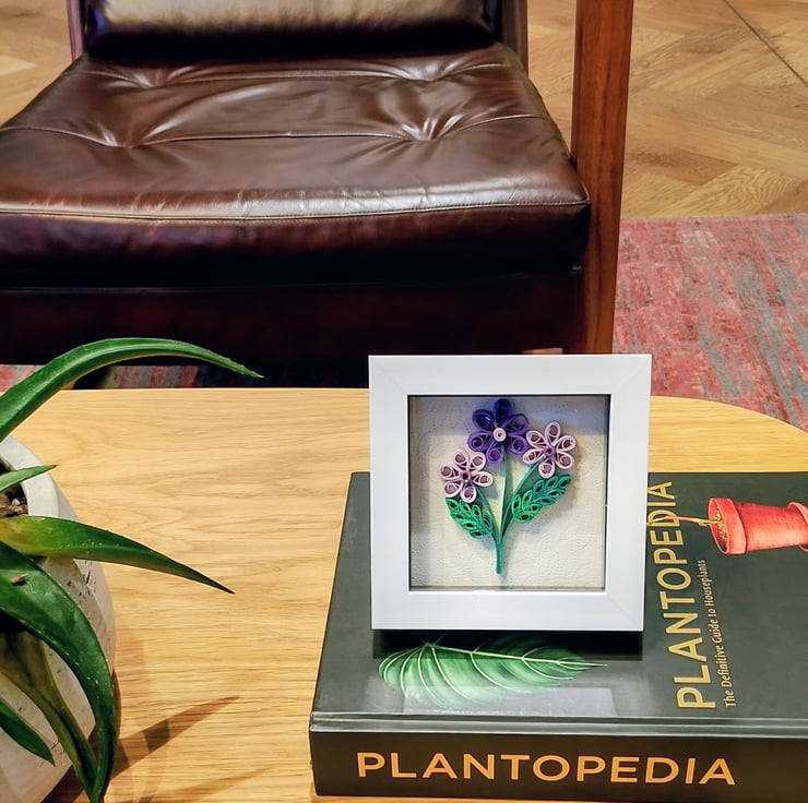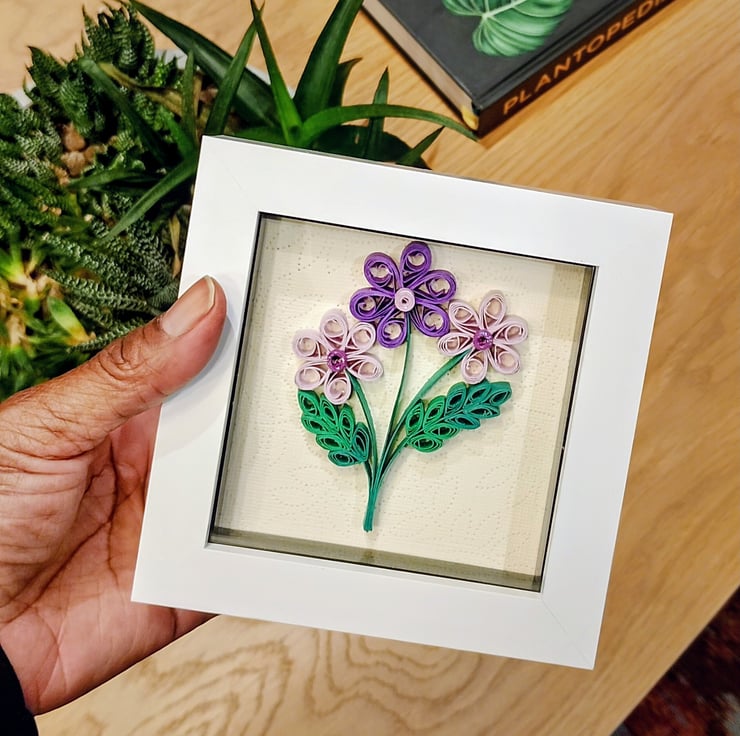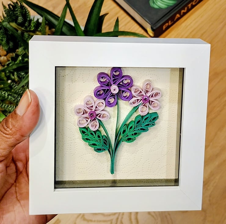 A cheerful paper flower bouquet with hints of sparkle, twirled from quality paper strips using traditional quilling techniques. This cute-size, forever floral frame brings a touch of beauty to any home and makes a charming, thoughtful gift for birthdays, anniversaries, weddings or for flower lovers any time of the year.