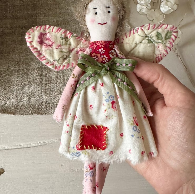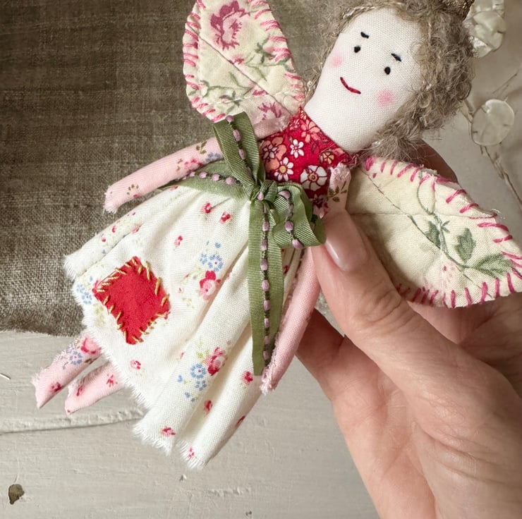 This little lady is made using both vintage and modern fabrics, and her wings are made from a piece of vintage quilt