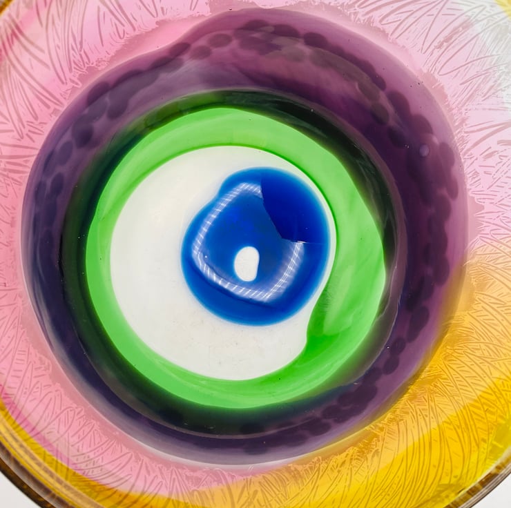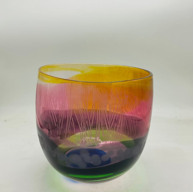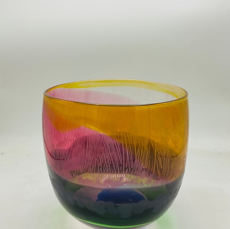 This is playing with transparents over lapping each other to give off different hues as you turn the bowl around. Once the bowl has cooled I add another dimension of sandblasted detail giving even more depth to the piece