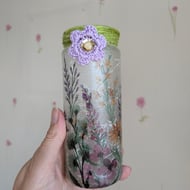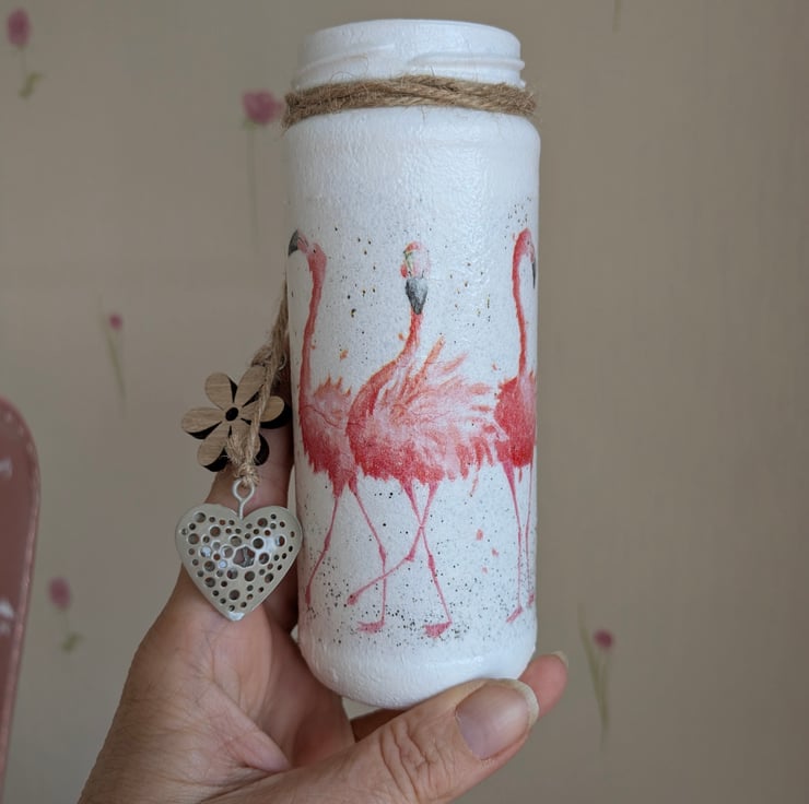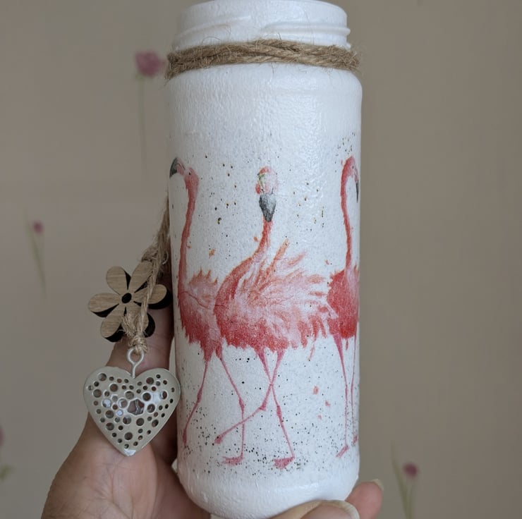 This is one of my decoupaged upcycled jars which shows three fancy flamingos on the front.