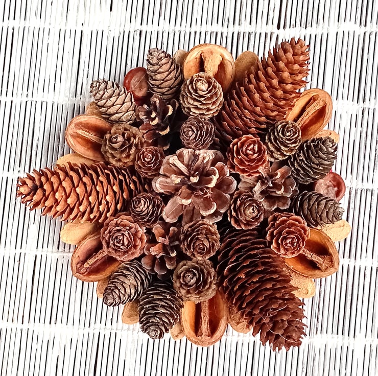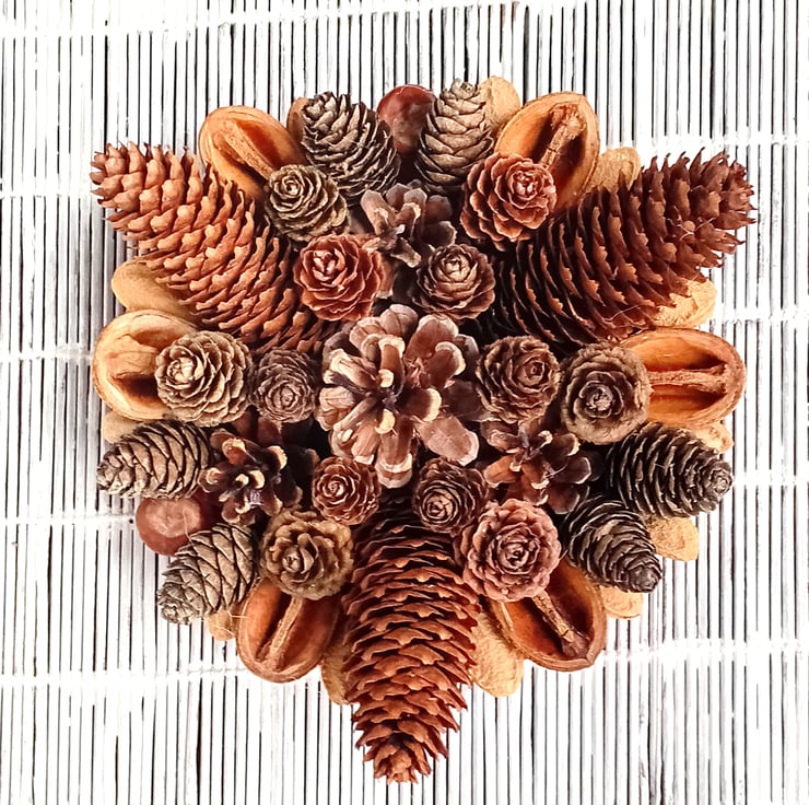 Small dried natural decorations mainly from tree cones - may include spruce, fir, alder and pine, plum stones, horse chestnut seeds (conkers!) - sourced from my own woodland and local trees. Roundel may also include lotus flower seed pods.