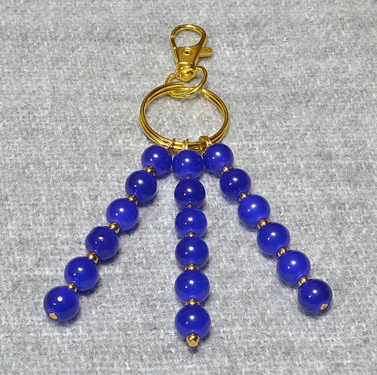 This vibrant blue bag charm, with gold-plated spacer beads, features three dangles hanging approximately 8.5cm, or 3 1/4 inches. They are hung from a gold-coloured split ring attached to a lobster clasp/lanyard clip.