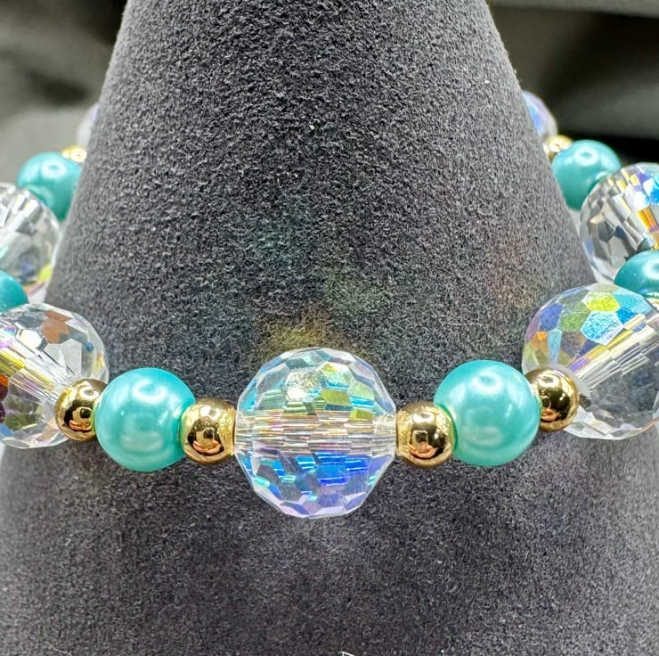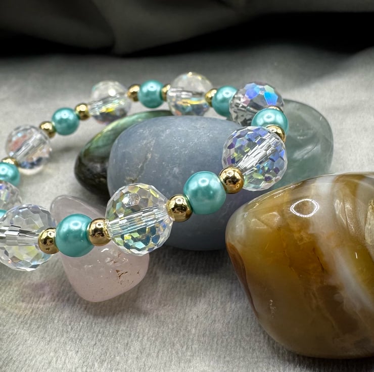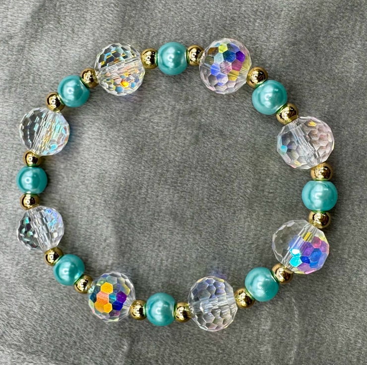 AB crystal and blue glass bead bracelet approx 6.5 inch elasticated, with 14k gold plated spacers.