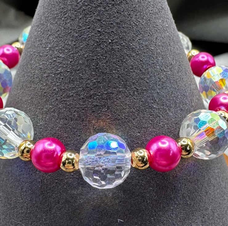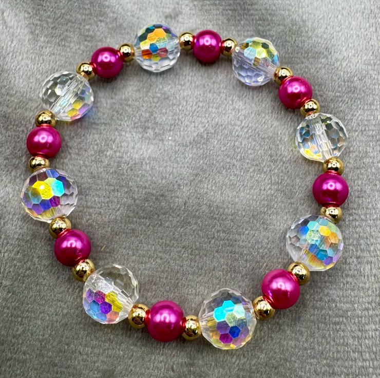 Crystal and pink glass pearl bead bracelet, approximately 6.5 inches with 14k gold plated spacers.
