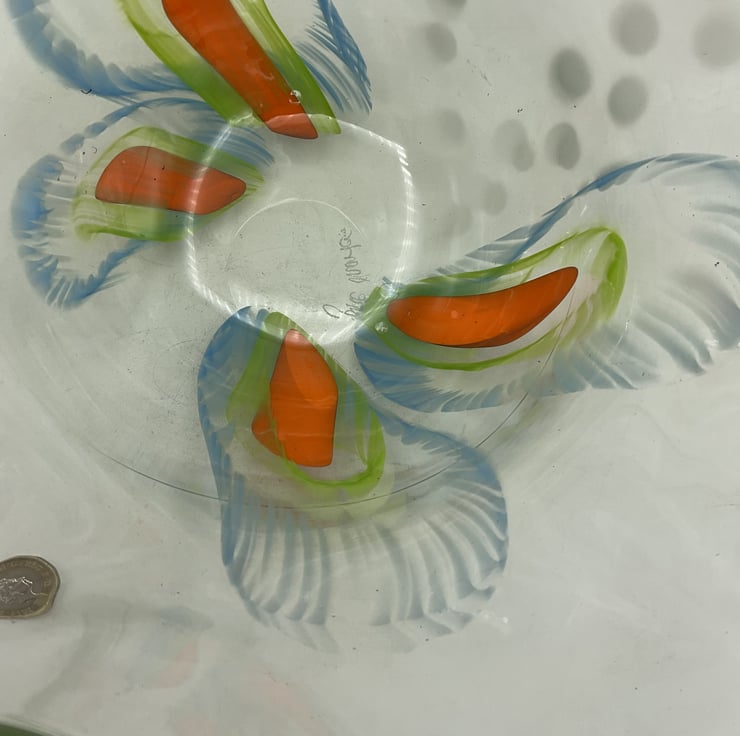 I love this ripple rim effect it’s another area on interest with the subtle play of light on the rim versus the bold orange , blue and green all finished off with a bit of sandblasted detail.