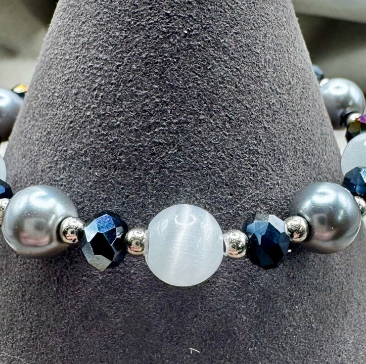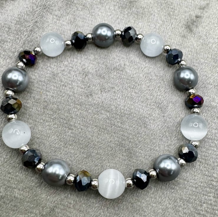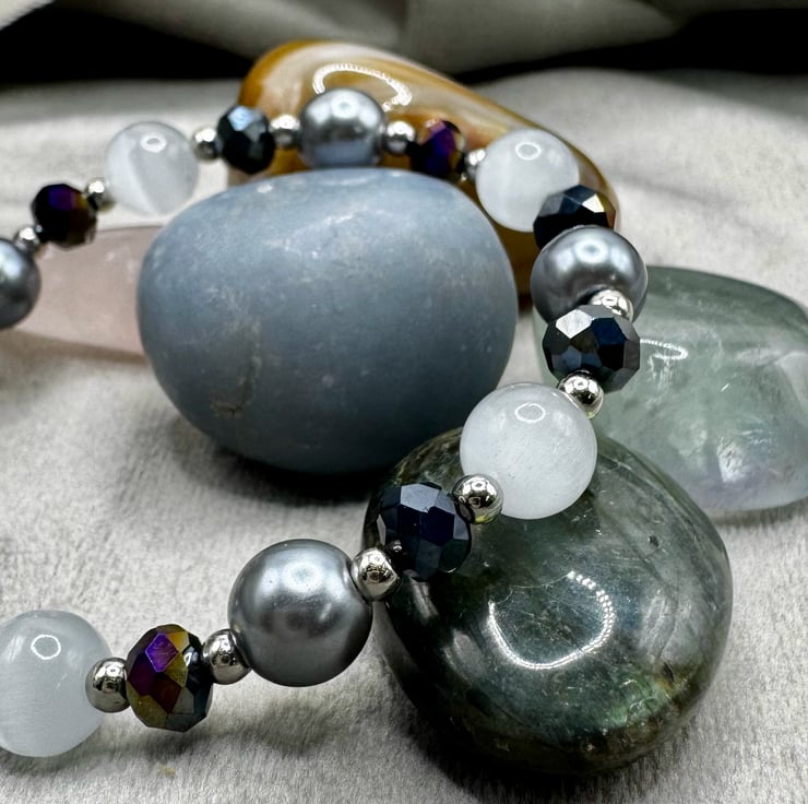 Moonstone and black crystal bracelet approximately 6.5 inches with silver coloured spacers.