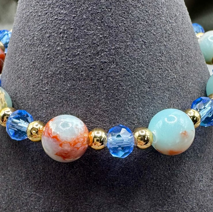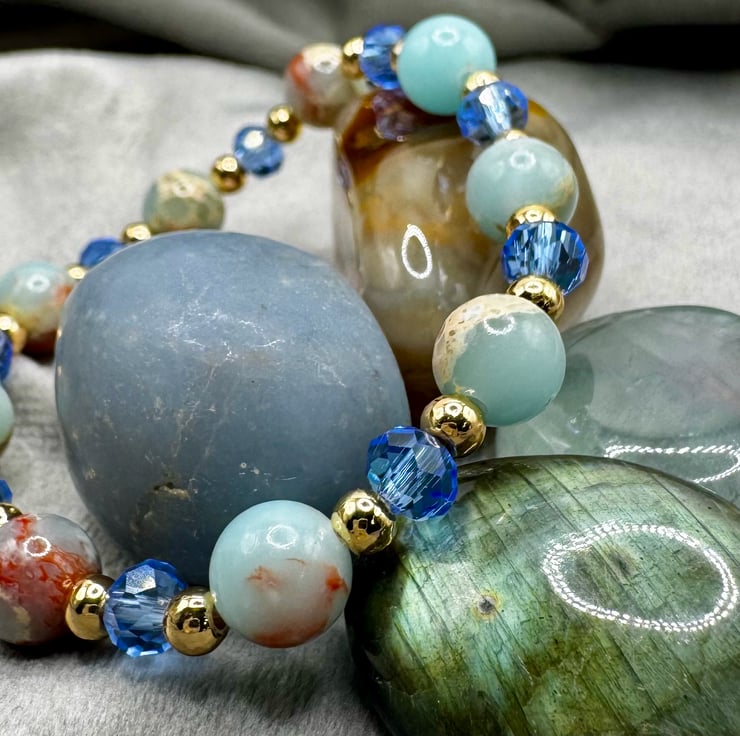 Imperial Jasper and periwinkle crystal beaded bracelet - approximately 6.5 inches long, elasticated with 14k gold plated spacers.