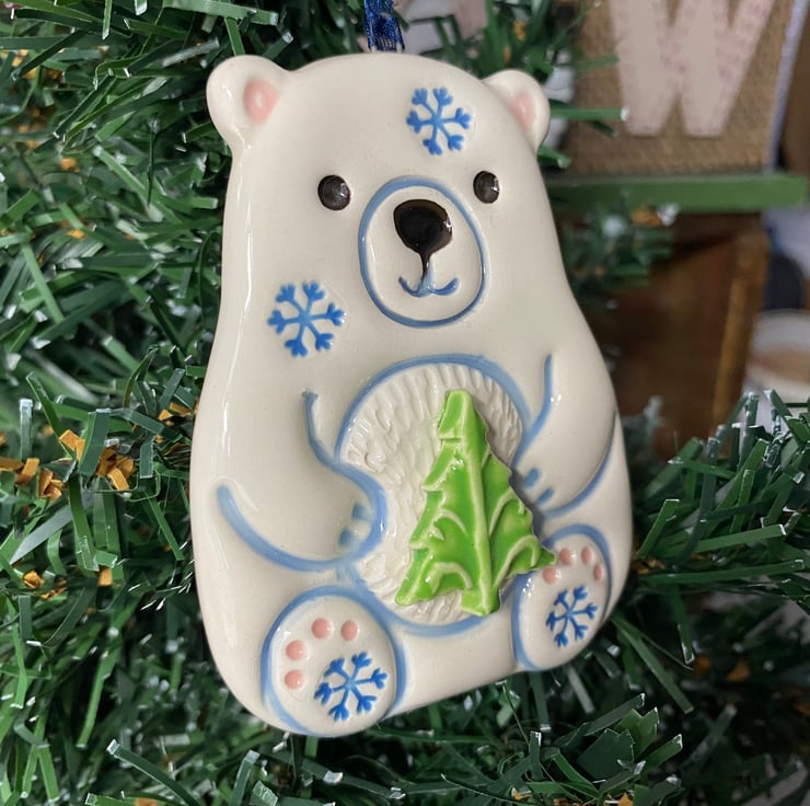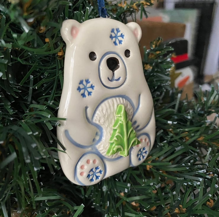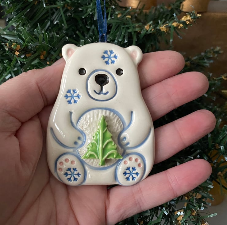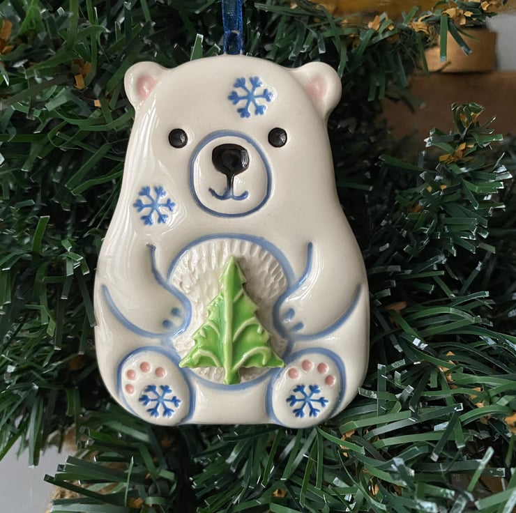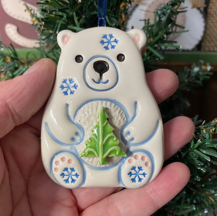 This super cute polar bear has snowy patterned fur. He's carrying a raised Christmas tree. He's made from white earthenware clay from an image that I designed myself.