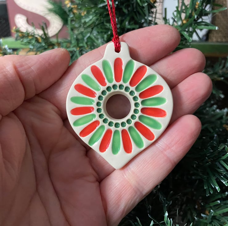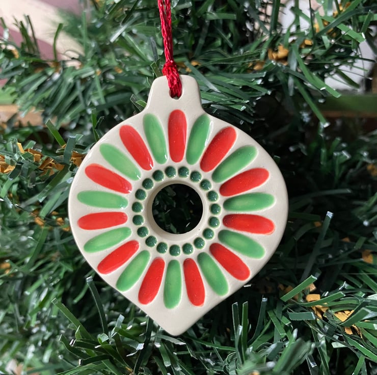This ceramic bauble decoration has a lovely bright design with a little hole in the middle. It's really cheerful! It is made from white earthenware clay and fired once, then glazed and fired again. It measures 5.5cm length and 4cm width and 0.5cm deep and hangs from a glittery red thread.