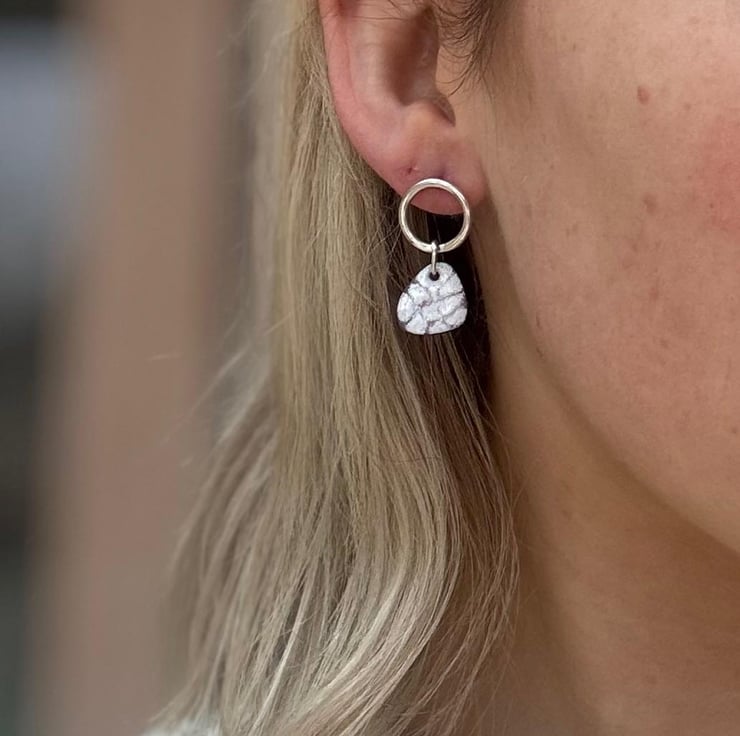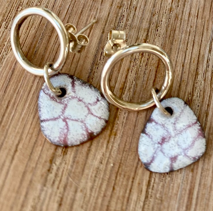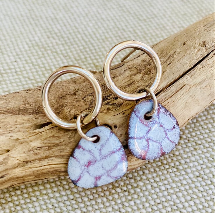 These pretty silver circle earrings with pebble shaped copper enamel drops in pink and white . These earrings are hand sawn copper torch fired enamel with handmade recycled silver drop wires .