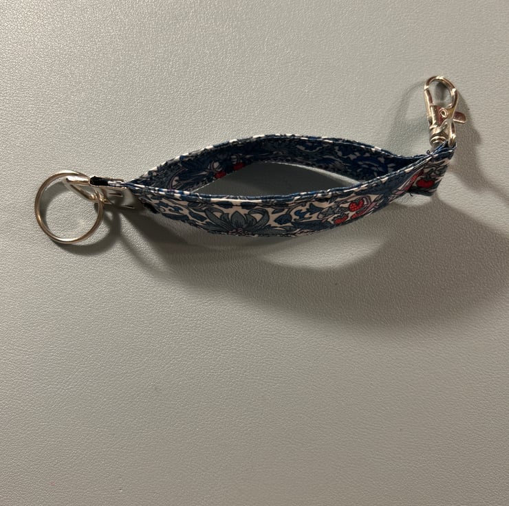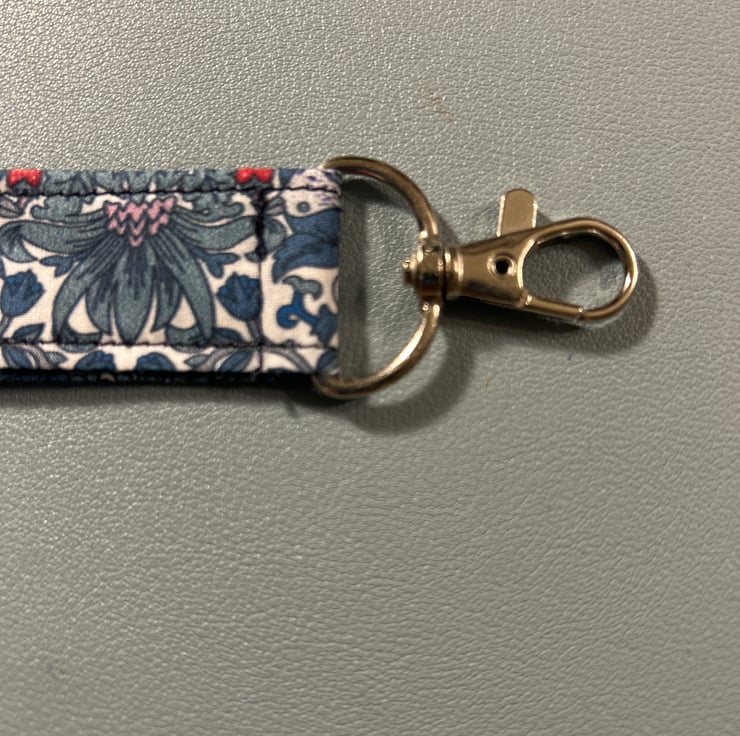 William Morris strawberry thief fabric. Clip to belt, bag etc. Great for dog walkers. Wristlets. Swivel lobster clip