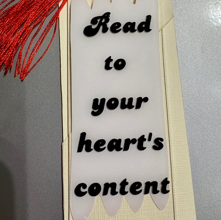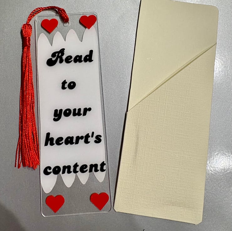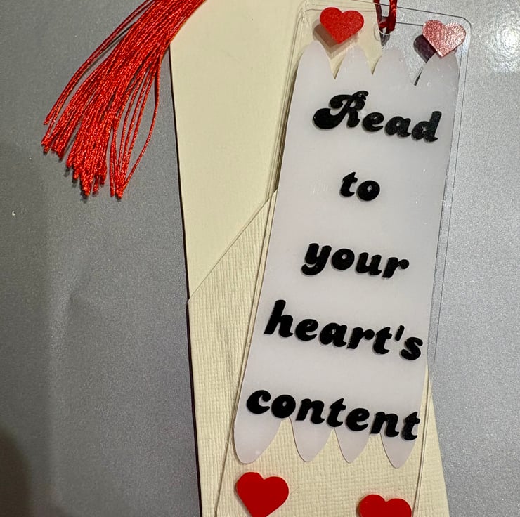 Add a little charm to your reading time with this handmade acrylic bookmark, featuring the sweet quote “Read to your heart’s content”. Made from clear acrylic with a soft frosted effect, each bookmark is beautifully finished with layered black vinyl lettering, bright red heart embellishments and a matching tassel for that perfect finishing touch.