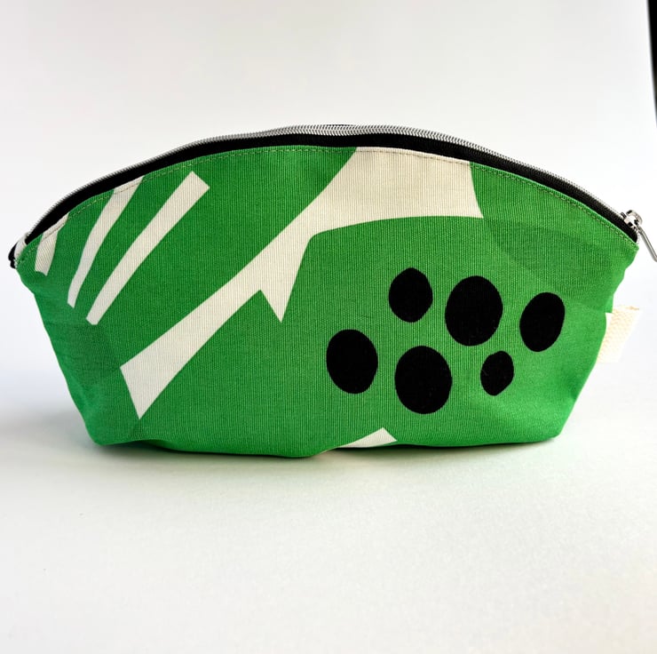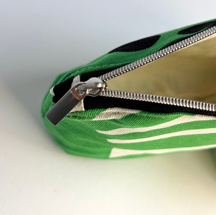 It is made from a vibrant green canvas with the addition of random black and white shapes. The lining is a cream cotton and the zip is black tape with silver coloured teeth and zip pull.