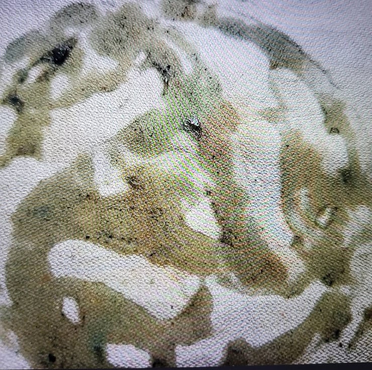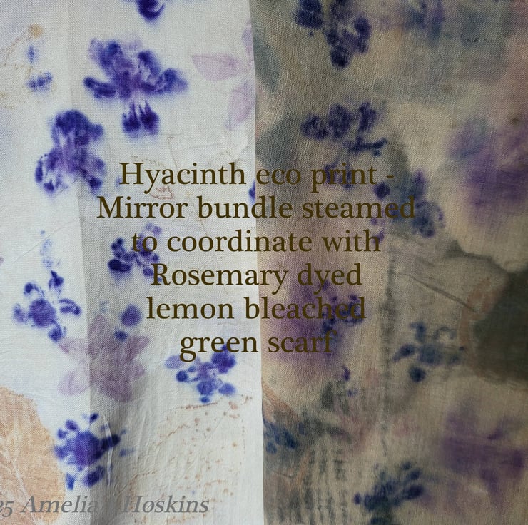 Fine wools scarf in rosemary dyed olive green with blurred flower shapes and hyacinth blue eco printed. Cream Ahimsa silk borders added with hand prints and eco printed blue hyacinths.