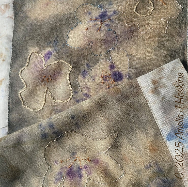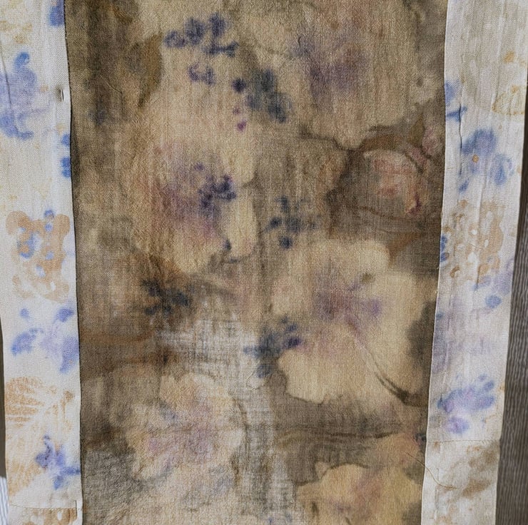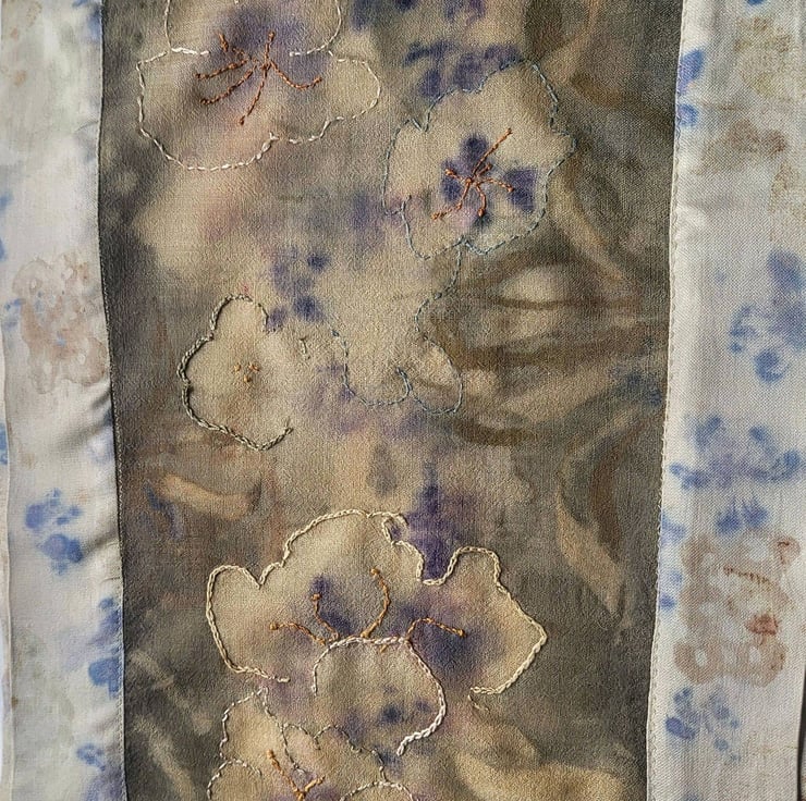 A scarf with a story... a silk painting of tulips, discharged through rosemary dyed wool: after steaming the tulips lost shape and became abstract flowers. Scarf and silk borders were bundle dyed with deep blue hyacinth flowers. Cream silk borders were added, lino printed with blue hyacinth flowers, brown Celtic pattern and green Celtic dragon. Embroidery was added to abstract flower shapes to give definition.