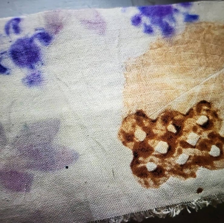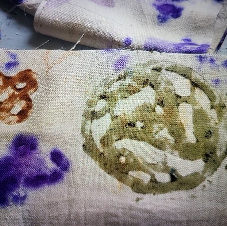 Fine Wool eco printed scarf with silk hand printed borders and hand dyed fringe