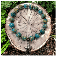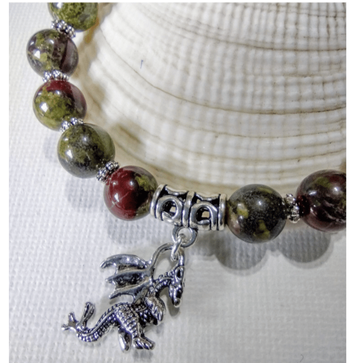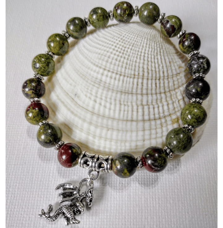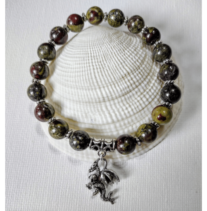 Handmade by myself unisex dragons Blood Jasper in rich olive greens, slate greens and red brown tones with antique silver spacer beads and striking 3d dragon charm on strong clear stretch cord. Dragons Blood Jasper activates all chakras and meridians and enhances our own spiritual growth. It helps us to build on the "real person" that we are, dissolving false images of the way that we see ourselves and promoting spiritual self-healing. Dragons Blood Jasper can also help us to raise the kundalini