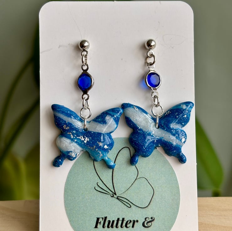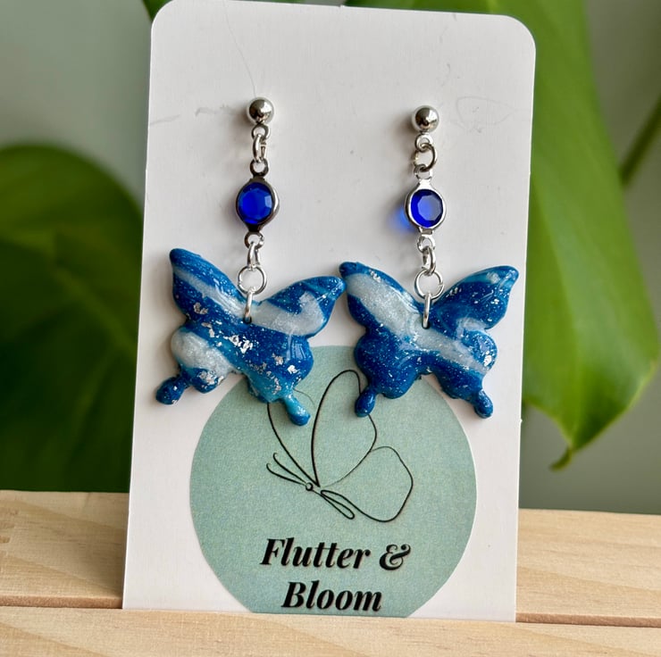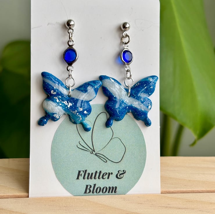 Let your style take flight with these handcrafted butterfly earrings — a dreamy dance of marbled wings and midnight sparkle. Each pair features a glossy butterfly charm in swirling shades of blue and white, suspended beneath a deep sapphire-toned gemstone encased in silver. The delicate chain link and polished silver colour stud add movement and elegance, making them perfect for both everyday whimsy and festive sparkle.