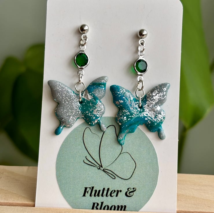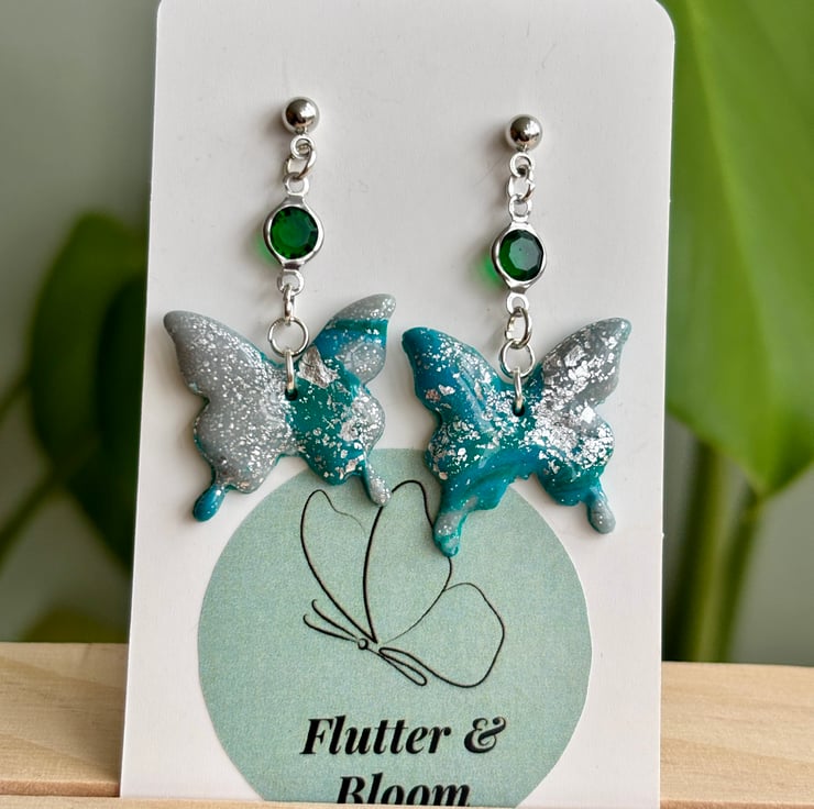 Teal Glitter Butterfly Earrings with Green Gemstone — Handmade Nature-Inspired D