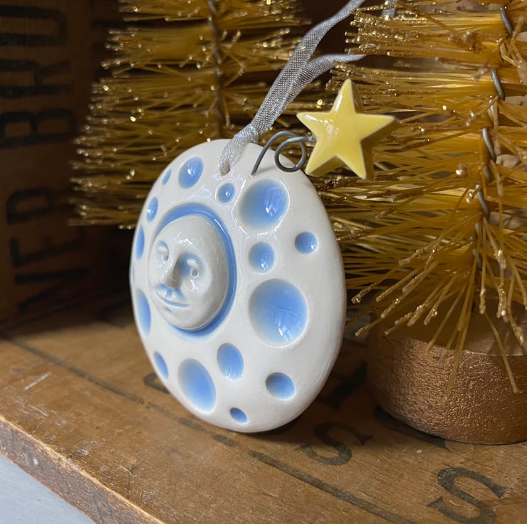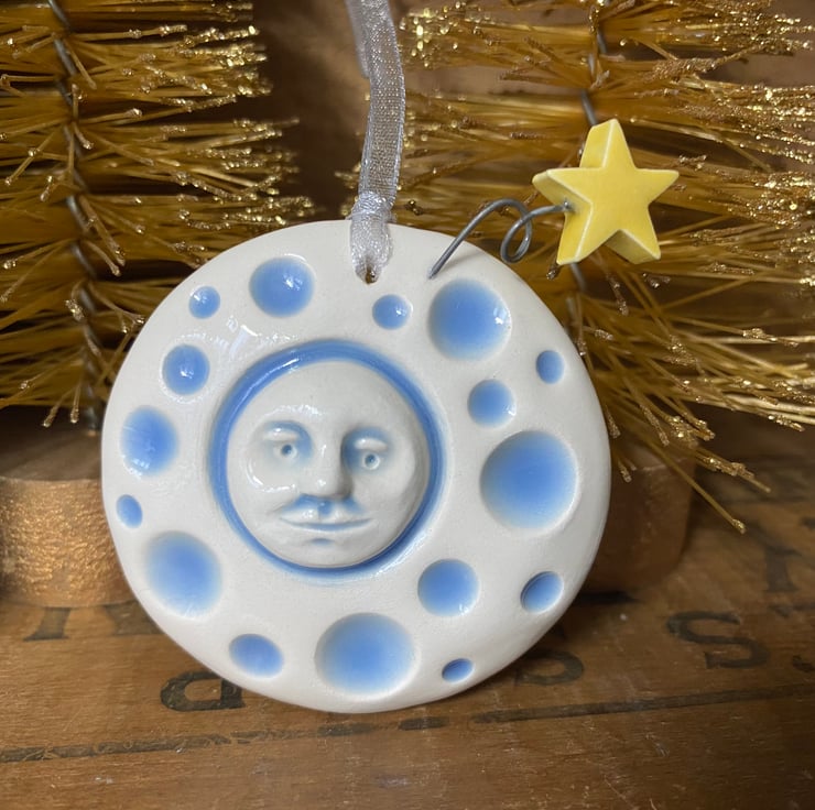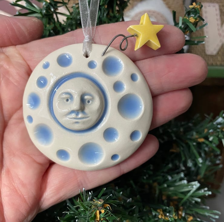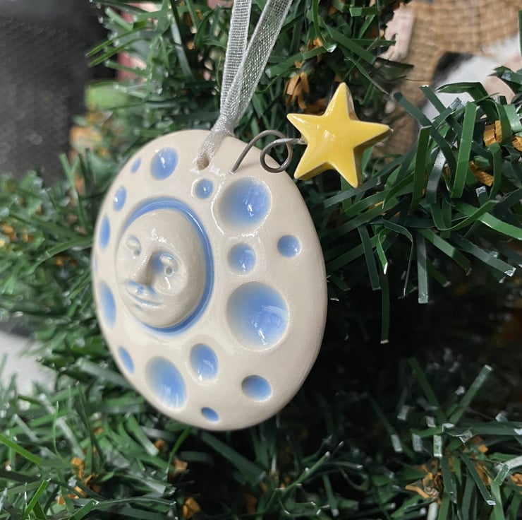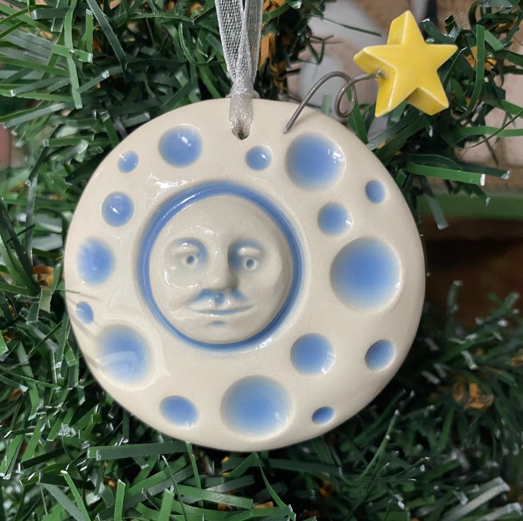 This cute pottery Christmas decoration depicts the man in the moon with a shooting star on a coiled wire detail. It is made from white earthenware clay, has been fired once glazed and fired again.
