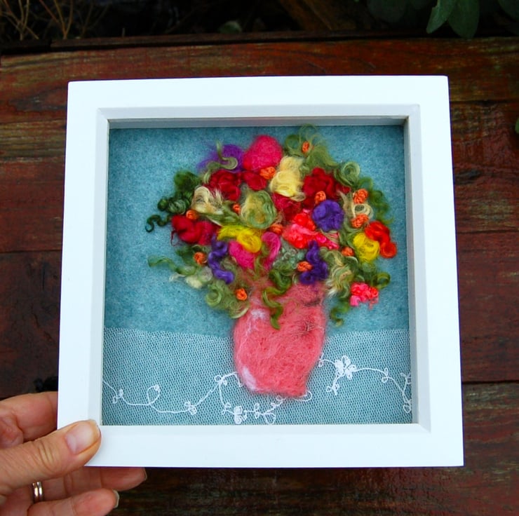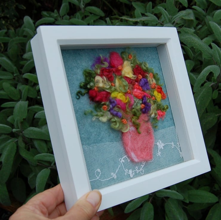The vase and flower are needleted onto a piece of duck egg blue felt. A pretty piece of off-white lace makes a lovely vintage tablecloth. The pink vase has been made using hand dyed wool fibres and the flowers are colourful dyed wool curls with wool french knots scattered about.