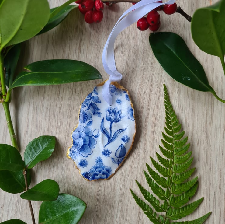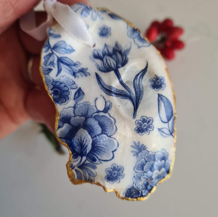 This oyster shell hanging decoration has been hand decorated with decoupage using a pretty blue and white floral design. I have painted the edge in gold paint, sealed it with gloss varnish and finished the decoration with a pretty white ribbon. I have varnished the back so you can see the lovely natural colours of the shell.